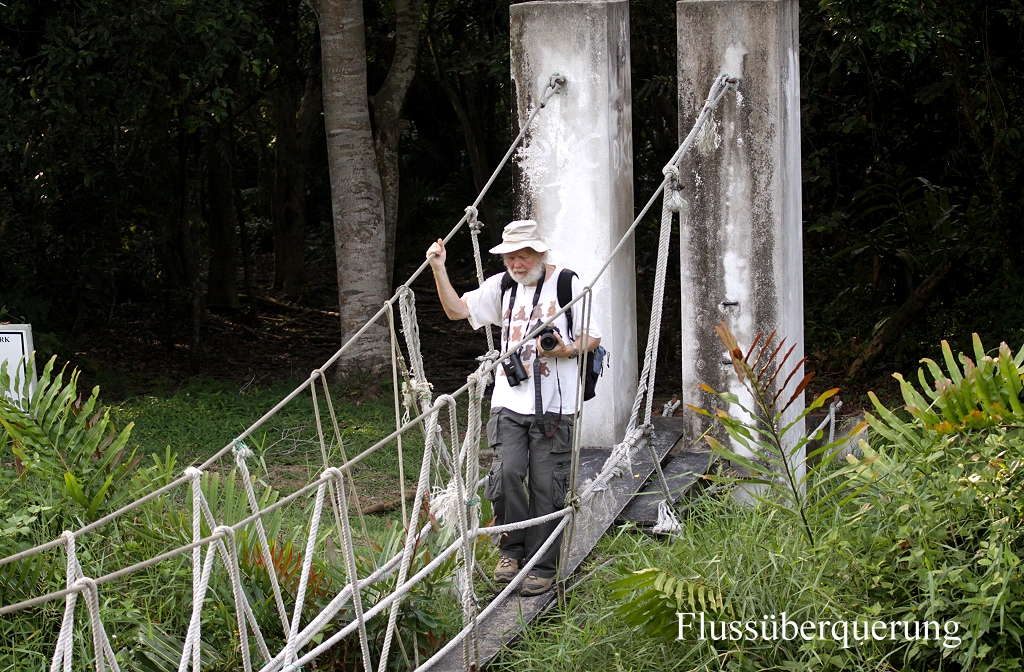 Wir gingen heute im wesentlichen den gleichen Trail wie gestern, nur diesmal in umgekehrter Richtung. Zunächst führte der Weg durch die Mangroven zu einem kleinen Fluss, den wir vorsichtig auf einer schwankenden Hängebrücke überquerten. |