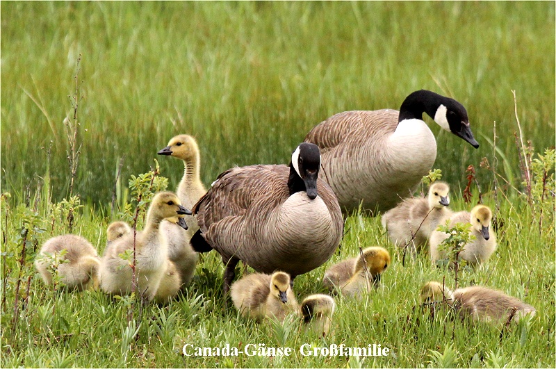 Der Regen hatte zwischenzeitlich aufgehört. Hier befindet sich ein kleines Forschungszentrum für Wildtiere aller Art. Mehrere Familien Kanada Gänse mit teilweise bis 16 Gänseküken spazierten durchs Gras oder schwammen im Wasser. Ferner sahen wir: Yellow-headed Blackbird, Red-winged Blackbird, Trumpeter Swan (5), Northern Shoveler, Cinnamon Teal, Gadwall, Great Blue Heron. |