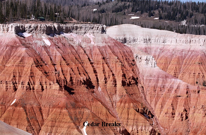 Auf dem Highway I-15 ging es dann zügig nach Norden. Von 800 m Höhe ging es stetig bergauf. Nach 49 Meilen erreichten wir Cedar City. Hier war es nur noch acht Grad. Wir bogen auf die US-14 nach Osten Richtung Cedar Breaks hoch in den Bergen, dass wir nach 45 Minuten erreichten. Cedar Breaks ist ein kleiner Nationalpark auf einer Höhe von 3.225 m. Ähnlich wie im Bryce Canyon fällt hier die Landschaft steil nach unten ab. Die Erosion hat ein 5 km breites, natürliches Amphitheater geschaffen. Die einzelnen roten Erdschichten mit zahlreichen Säulen ergeben ein phantastisches Bild. Am Visitor-Center zogen wir uns erst mal warme Klamotten an. Überall lagen noch Schneereste. Die ersten Blumen und Pflanzentriebe wagten sich an die Oberfläche. Wir erwarben für 80$ einen Eintrittpass für alle amerikanischen Nationalparks, gültig für ein Jahr. |