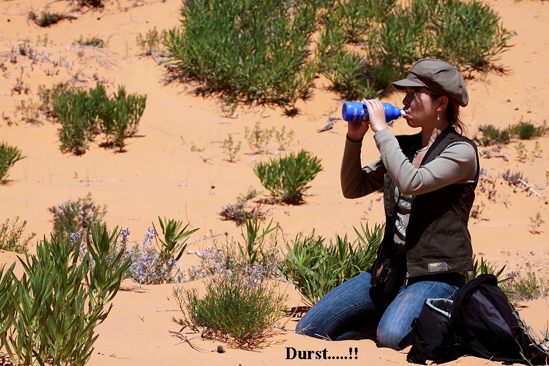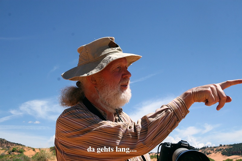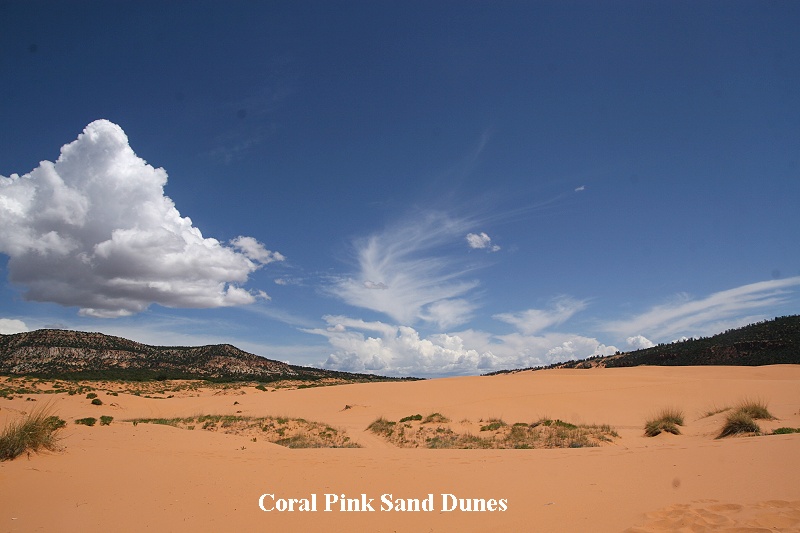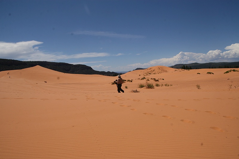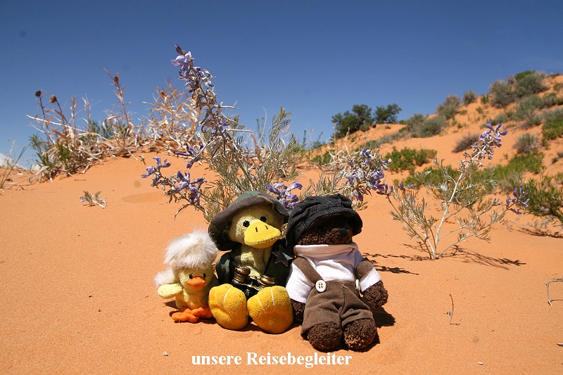 Stattdessen fuhren wir ca. 65 km in südlicher Richtung zum "CORAL PINK SAND DUNES" State Park. Wie der Name schon sagt, gibt es hier eine ziemlich große hügelige Fläche aus rosaorangenem Quartzsand. Die einzelnen teilweise hohen Dünen hoben sich im grellen Sonnenlicht markant ab von den umliegenden Bergen. Wir wanderten ca. 2 km durch den angenehm weichen Sand. Da diese Gegend in 1.800 m Höhe liegt, lagen die Temperaturen bei angenehmen 22°. Erstaunlich war zu sehen, |