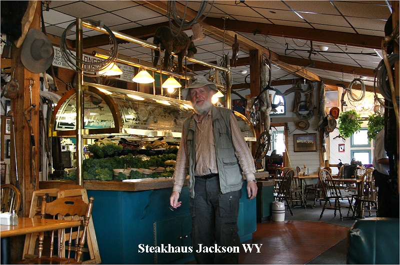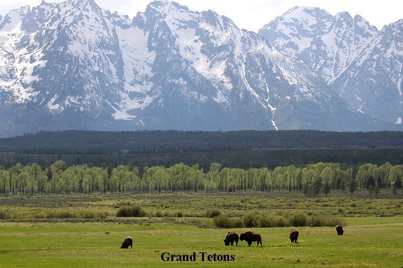 Zum Mittagessen fuhren wir in die Signal-Lodge, wo wir um 15:00 Uhr ein sehr leckeres mexikanisches Burrito (ich) und ein Thunfischsandwich mit Salat (Tomoko) aßen. Der Kaffee dazu schmeckte ausgezeichnet, was in USA nicht oft vorkommt. Beim Verlassen des Restaurants sahen wir wieder einige Chipmunks, kleine Hörnchen. Über den Highway US-189 machten wir uns nun auf den Heimweg. Das sonnige Wetter eröffnete uns herrliche Ausblicke auf die teilweise über 4.000 m hohen schneebedeckten Tetons (der höchste, der Grand Teton ist 4.160 m hoch). Unterwegs sahen wir wieder einige Bisons und kurz vor Jackson in einiger Entfernung 2 Kranichpaare, die Futter suchend auf einer großen Wiese spazierten. |