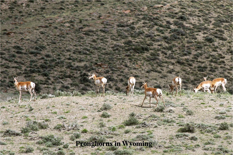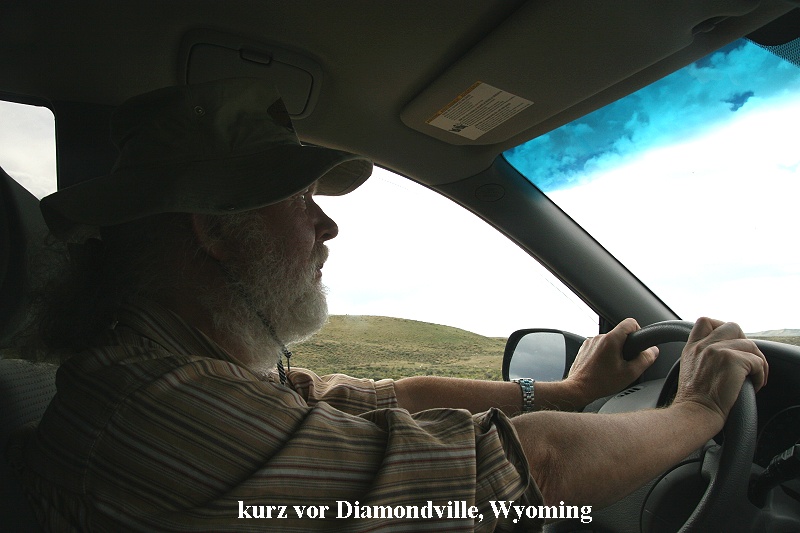 Nach anfänglich schönem Gebirge erwartete uns jetzt eine schier endlose Graslandschaft. Zahlreiche Rinder und Schafe grasten hier. Hin und wieder sahen wir auch kleine und größere Herden von Pronghorns, einer amerikanischen Antilopenart. Unser Toyota lief tadellos. Bei einem Tankstopp stellte ich fest, dass das Auto ca. 9,5 l Normalbenzin auf 100 km verbrauchte. Das Benzin ist im Gegensatz zu Deutschland erheblicher billiger, umgerechnet nur 0,44 € / Liter (im Laufe der Reise stieg der Benzinpreis weiter um 4 - 5 Cent). Nach 616 km und 7 Stunden Fahrtzeit erreichten wir um 16:30 Uhr Diamondville, einen kleinen Ort mitten in der Prärie, ca. 260 km |