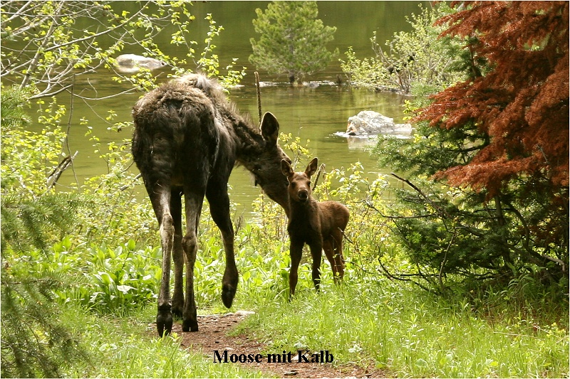 Plötzlich tauchte wie aus dem Nichts eine Elchkuh mit Kalb aus dem dichten Nadelwald auf. Es gelang uns, schnell ein paar Fotos zu machen, bevor beide wieder im Dickicht verschwanden. Wir waren überglücklich über diese unverhoffte Begegnung. Auf dem Rückweg zum Auto fing es wieder etwas an zu regnen. Tomoko zog ihren Regenponcho an, doch der Regen hörte bald wieder auf. |