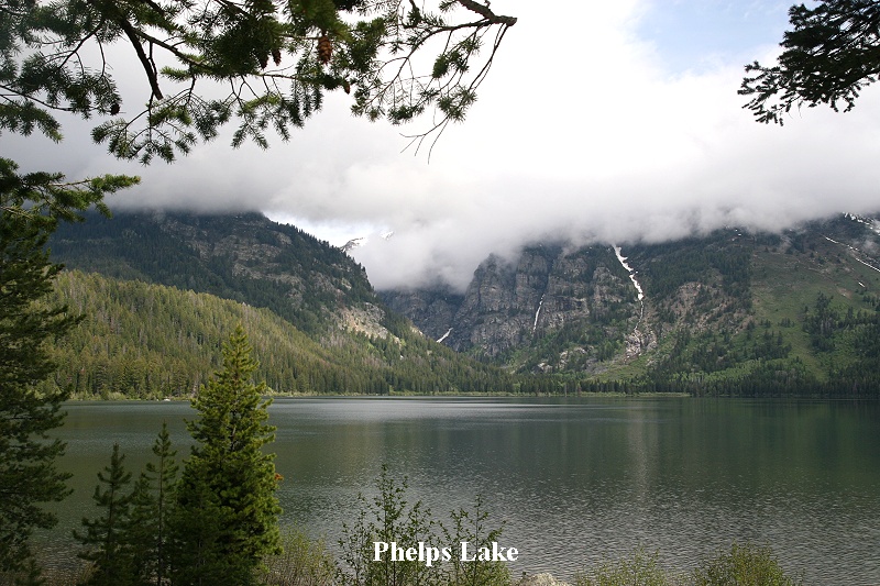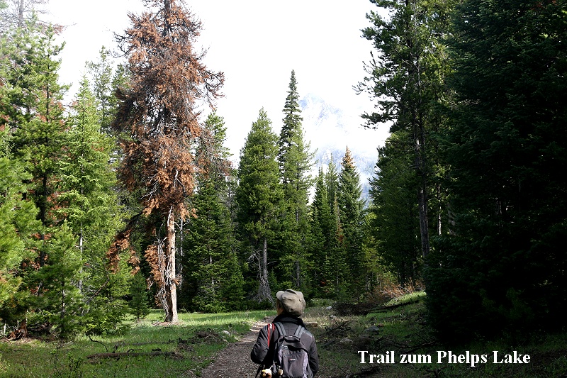 Um 6:00 Uhr wurden wir wach. Das Wetter sah etwas besser aus, obwohl noch dichte Wolken den Blick auf die Berge verdeckten. Das Frühstück war sehr einfach, der Frühstücksraum ziemlich voll. Gegen 8:00 Uhr fuhren wir ab Richtung Nationalpark. Dort nahmen wir die Wilson Road, eine kleine Straße, die in südwestlicher Richtung wieder aus dem Park herausführt. Wir hielten aber vorher am Anfang eines Wanderwegs zum Phelps-See an. |