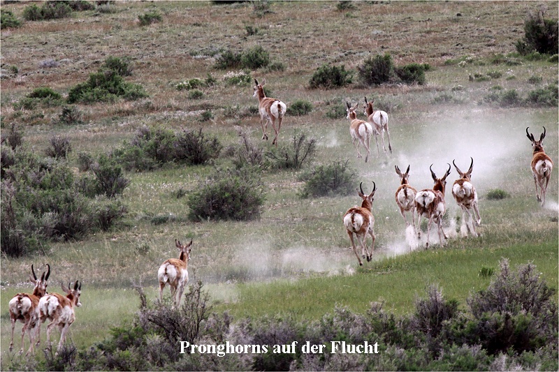 Die Temperatur war einige Grad wärmer als gestern morgen. Nach dem Frühstück packten wir unsere Koffer und um 9:30 Uhr ging es dann los Richtung Norden, immer auf dem Highway US-89 Richtung Salt Lake City. Es herrschte wenig Verkehr, die Sonne schien und durch endlose Wiesen ging es zügig voran. Nur in Panguitch hatten wir eine kleine Verzögerung, als eine Viehherde von Cowboys über die Straße getrieben wurde. Kurz vor Salt Lake City bogen wir nach Nordosten ab, erreichten den Freeway I-80 und gelangten nach insgesamt 6 Stunden Fahrt nach Wyoming. |