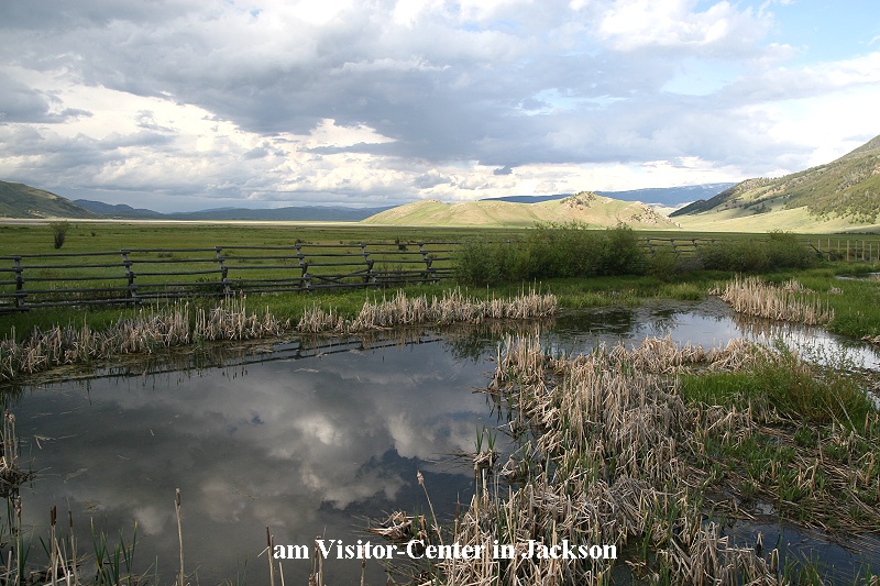 Also, noch ein wenig länger schlafen?! Tomoko war hellwach, daher stand auch ich auf und schaute ein wenig Nachrichten im Internet, bevor wir zum Frühstück gingen. Dieses war erstaunlich gut. Pünktlich um 8:00 Uhr machten wir uns auf den Weg Richtung Grand Teton NP. Wieder ging die Fahrt durch endlose Graslandschaften, vereinzelt waren wieder Pronghorns zu sehen. Ingesamt acht Fischadler konnten wir beobachten sowie Northern Harrier, Red-tailed Hawk, American Kestrel, White Pelican, Canada Goose, Cliff Swallow, Tree Swallow, Wilsons Phalarope, Long-billed Curlew. Es regnete während der gesamten Fahrt und bei nur 6° Außentemperatur mussten wir natürlich die Heizung einschalten. Gegen 13:00 Uhr erreichten wir dann nach 263 km Jackson WY. Am Ortseingang sahen wir das schon seit unserer Reise vor fünf Jahren bekannte Super-8 Motel. Wir konnten ein Zimmer für 109 Dollar bekommen und auch gleich beziehen. Um 13:30 Uhr fuhren wir dann wieder los in den Grand Teton NP. Die über 4000 m hohen Berge waren leider in Wolken gehüllt. Gleich bei der Anfahrt sahen wir einen Kranich in der Wiese stehen. Obwohl wir insgesamt 120 km rund durch den NP fuhren, sahen wir nur einige Buffalos, Elks und Pronghorns, leider keinen einzigen Elch (moose). Der Snake River führte Hochwasser und die Wiesen waren teilweise überschwemmt. Im Visitor-Center wärmten wir uns etwas auf. Die Fahrt war insgesamt etwas ermüdend, aber als wir gegen 16:00 Uhr nach Jackson zurück kamen, hielten wir am Visitor-Center am Ortseingang an und wurden reich belohnt. |