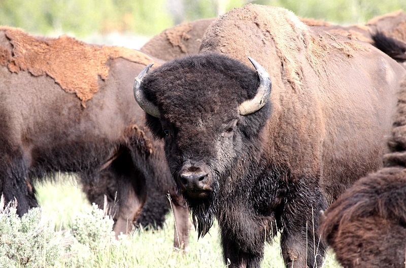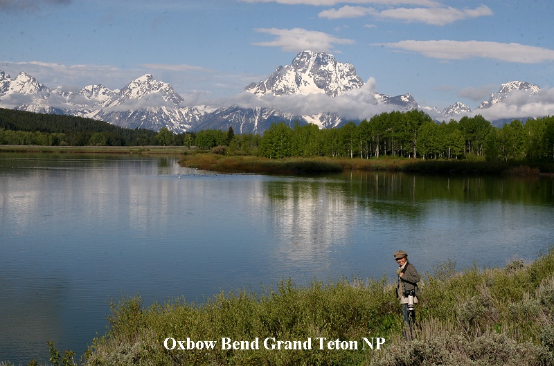 Auf der Hochfläche lagen noch Nebelreste, die einen herrlichen Kontrast zu den jetzt fast wolkenfreien, von der Morgensonne angestrahlten hohen Bergketten bildeten. Eine Büffelherde graste friedlich in der Nähe der Straße. Am Snake River (Oxbow Bend) stiegen wir ebenfalls aus und machten ein paar herrliche Fotos. |