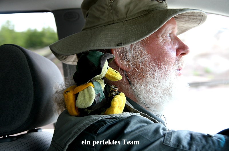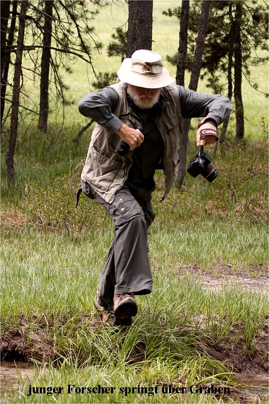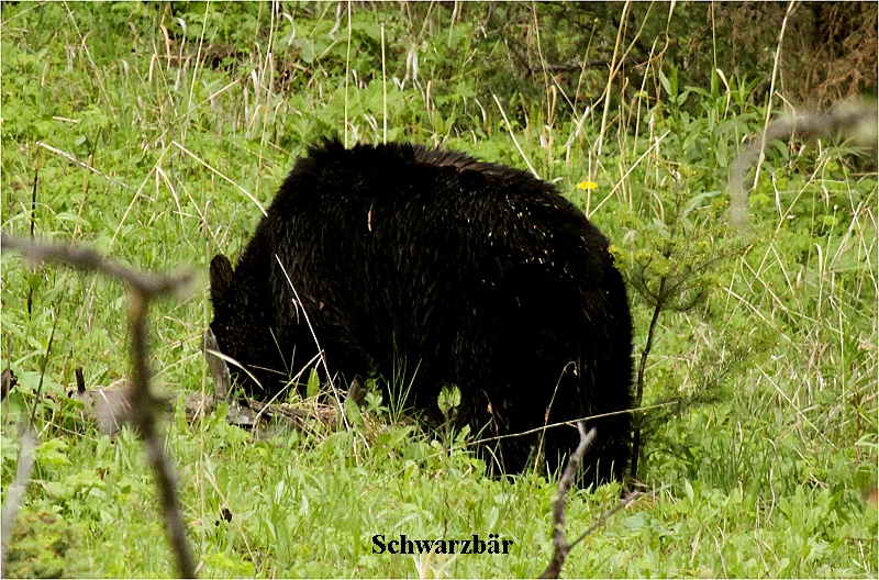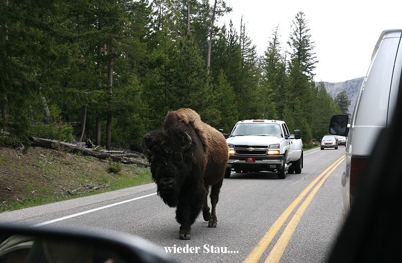 Plötzlich kam uns auf der Straße ein weiterer Kojote entgegen, den wir fälschlicherweise zunächst für einen Wolf gehalten hatten. Des weiteren sahen wir noch einige Pronghorns, einen Kranich und einen Phalarope (Odinshühnchen). Ganz plötzlich setzte der Regen ein. Wir fuhren langsam weiter. Plötzlich zwei Ranger auf der Straße, die den Verkehr flüssig hielten. Den Grund sahen wir sofort. In circa 50 m Entfernung bewegte sich ein schwarzer Black Bear (es gibt auch braune...)langsam Futter suchend durch Gras. Das Licht war durch den Regen leider nicht sehr gut, so dass kaum ein gutes Foto zu erwarten war. Weiter ging's bergauf. Die Schneereste wurden immer dicker. Im Winter muss hier der Schnee meterhoch liegen. Nach einer weiteren halben Stunde Fahrt plötzlich halt. Eine große Bisonherde bewegte sich mitten auf der Straße langsam auf uns zu. Nach 5 min stehen konnten wir auf unserer Seite weiter fahren, die Autoschlange, die uns entgegenkam, war dagegen mindestens 2 km lang. Nach einer weiteren halben Stunde nochmals eine ähnliche Situation. Wieder standen mehrere Bisons auf der Straße, doch langsam konnten wir vorbeifahren. Gegen 18:00 Uhr kamen wir endlich müde in West-Yellowstone an. Der Regen hatte aufgehört. Im Supermarkt kauften wir wieder unser Abendessen ein (Salat und Crackers, dazu ein kühles Beck`s-Bier). Den Abend verbrachten wir entspannt in Zimmer (Tagebuch, Internet, Fotos...). Um 21:30 Uhr gingen wir dann ins Bett. |