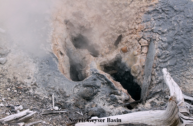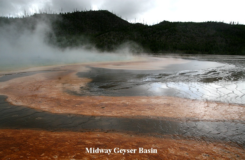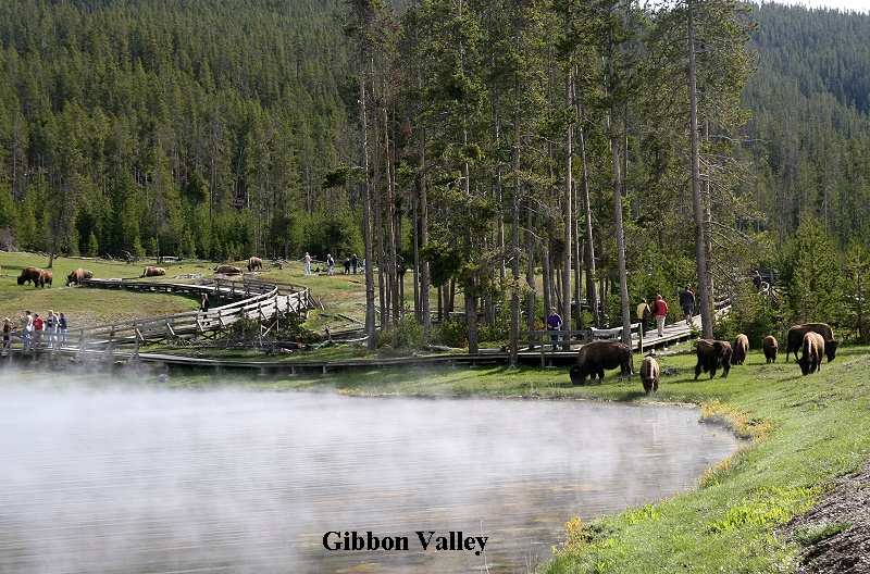 Außer dem Bald Eagle konnten wir mehrere Fischadler sehen, natürlich auch wieder viele Bisons und Elks. Am mittleren Geysir Basin machten wir halt und begaben uns auf den hölzernen Steg, der zwischen den einzelnen heißen Quellen hindurchführte. Es war inzwischen saukalt geworden. Ein eisiger Wind trieb die feuchten Nebel- |