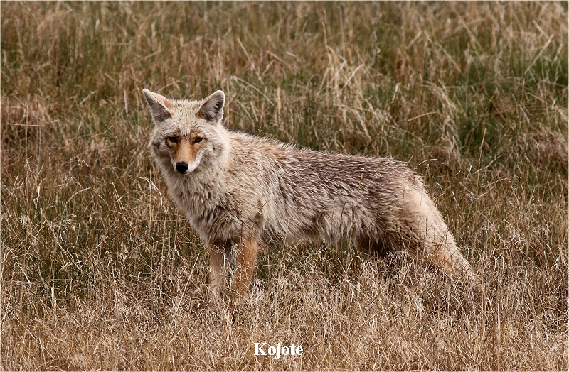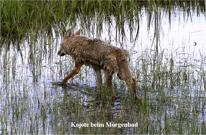 Nach weiteren 7 Meilen hinter einer Brücke über den Madison-River sah Tomoko plötzlich einen Kojoten aus dem kalten Wasser steigen (und das bei 5° Außentemperatur!). Er trottete dann gemütlich durch die Wiesen davon. In der Ferne sahen wir mehrere Bisons und Elks, einen weiblichen Merganser (Gänsesäger) auf dem Fluss schwimmend, mehrere Kanadagänse sowie einen Kranich. |