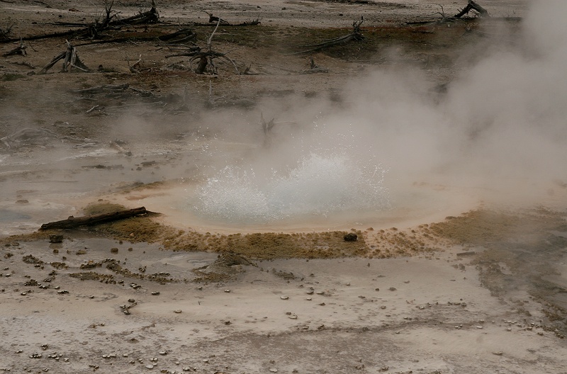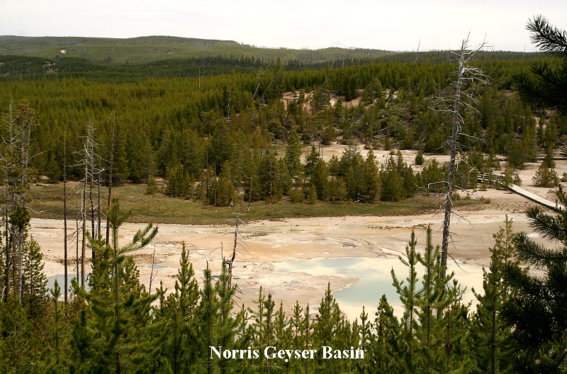 Bei der Madison Junction fuhren wir nach Norden durch dasibbon Valley zum Norris Geysir Basin. Hier wanderten wir einen rund 1,6 km langen Trail auf Holzstegen durch die bizarre Landschaft. Überall zischte und brodelte es, immer wieder Tümpel, wo kochendes Wasser oder Schwefeldämpfe an die Erdoberfläche drangen. Manche Quellen leuchteten hellblau, die Ränder vom Schwefel gelb oder rostig braun gefärbt. Wir wanderten hier eine gute Stunde umher. Da das Frühstück nicht besonders reichhaltig war, meldete sich früh der Hunger. Wir fuhren ein paar Meilen weiter Richtung Mammoth Hot Springs und suchten uns einen Picknickplatz. Unterwegs standen plötzlich circa 10-15 Autos am Straßenrand. Man hatte wohl kurz vorher einen Grizzly hier gesehen. Leider war er nicht mehr da. |
