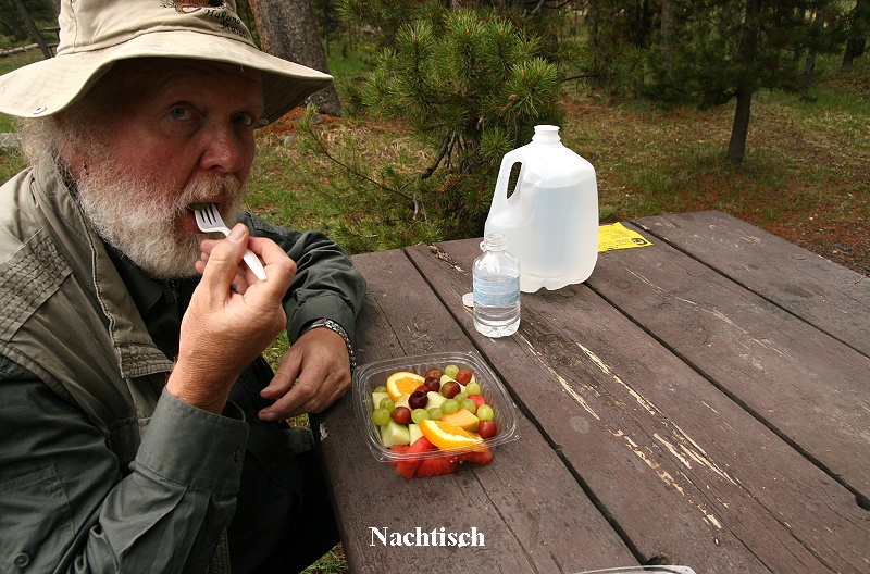 Bei der Weiterfahrt entdeckte ich plötzlich am Straßenrand eine Ruffed Grouse (männlich) mit stolz gespreizten Schwanzfedern und aufgeblähter Halskrause. Wirklich viel Glück gehabt! Dann ging es weiter Richtung Norden durch endlose Nadelwälder, vorbei an von der Schneeschmelze schäumenden Flüssen und klaren Seen. Gegen 12:00 Uhr erreichten wir Grant Village im Yellowstone NP. Da wir Hunger verspürten, aßen wir hier einen Cheeseburger mit Salat. |