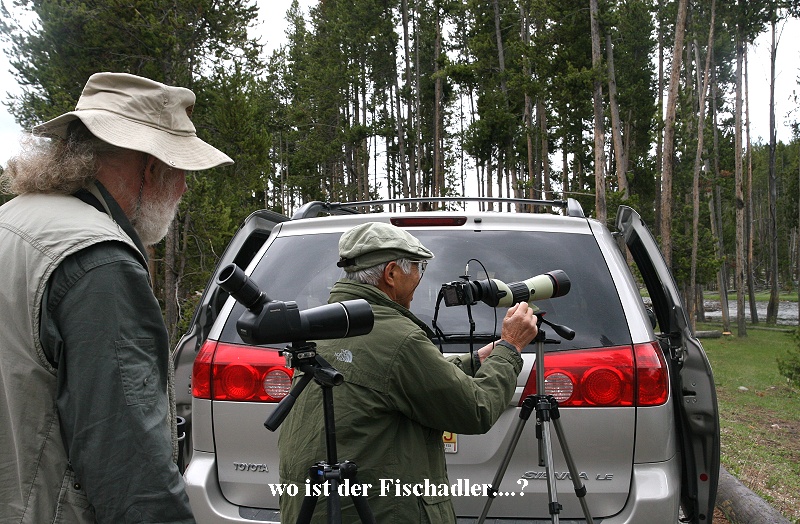 schwaden vor sich her. Diese wärmten ein wenig, sorgten aber auch für durchnässte Kleidung. Hier sprudeln in jeder Sekunde 2000 l heißes Wasser (75°) aus der Erde und fließen in den nahe gelegenen Fluss. Nach einer halben Stunde erreichten wir fröstelnd wieder unser Auto und fuhren weiter zum Old Faithful Geysir. Dieser hatte gerade eine Eruption gehabt, als wir gegen 17:00 Uhr dort eintrafen. Da der nächste Ausbruch erst für 18:25 Uhr angekündigt war, besuchten wir nur kurz das Visitor Center und fuhren dann zurück. Zweimal stoppten wir noch kurz, um Fischadler zu beobachten. Als wir das Bald Eagle Nest erreichten, regnete es kräftig. Der Adler saß diesmal nicht im Nest sondern auf einem daneben stehenden Baum, sehr gut zu sehen. Gegen 19:00 Uhr erreichten wir West-Yellowstone. Wir fanden ein uriges kleines Restaurant im typischen Western Stil. Es war gut besucht. Das Essen war nicht überragend, aber auch nicht schlecht. Leider gab es kein Bier. Das tranken wir dann gegen 20:30 Uhr auf dem Zimmer. Es regnete immer noch. Hoffentlich wird das morgen besser. Gegen 21:30 Uhr gingen wir schlafen. |