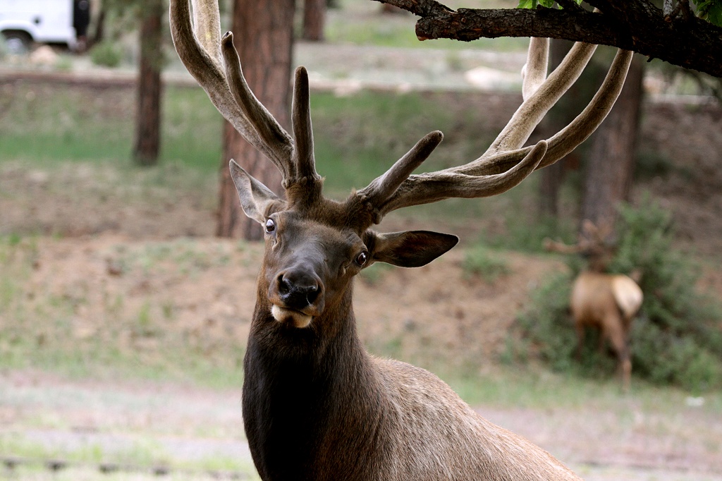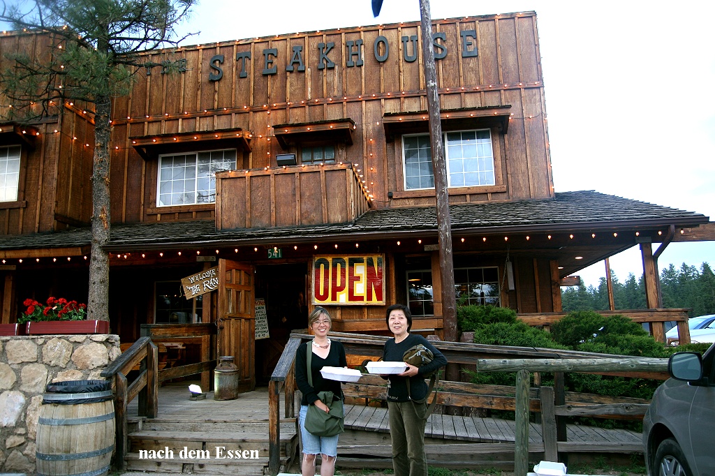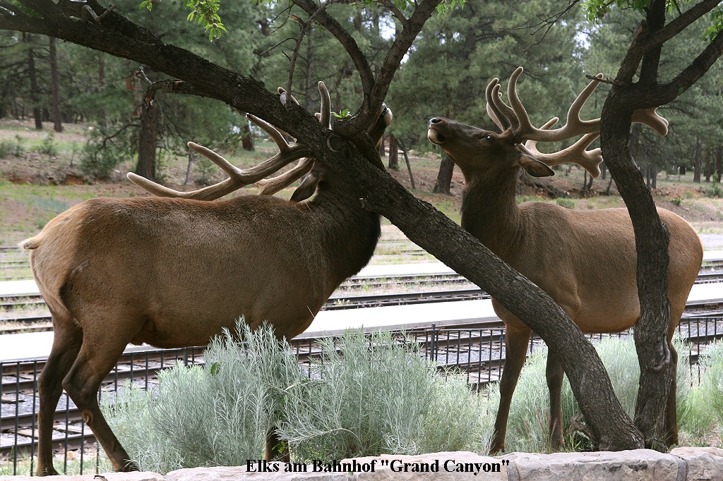 Als erstes sahen wir fünf große Hirsche mit prächtigem Geweih. Da es zu regnen anfing, gingen wir zunächst mal in den Hopi-Giftshop. Tomoko kaufte mir dort ein schönes schwarzes T-Shirt. Anschließend suchte ich mit dem Fernglas die Felswände ab, konnte aber leider keinen Kondor entdecken. Der Regen wurde immer stärker. Somit beschlossen wir nach Tusayan zurückzufahren, wo sich auch unser Hotel befand. Als Ausweichprogramm beschlossen wir, im dortigen IMAX-Kino einen Film über den Grand Canyon anzusehen. Der war sehr beeindruckend. Tomoko wollte aber nicht mit, da sie fürchtete, die spektakulären Szenen seien nicht mit ihrer Höhenangst vereinbar. Sie hatte sicher recht damit. Der Film dauerte 34 min und als wir aus dem Kino kamen, hatte der Regen aufgehört und die Sonne lachte vom blauen Himmel. |