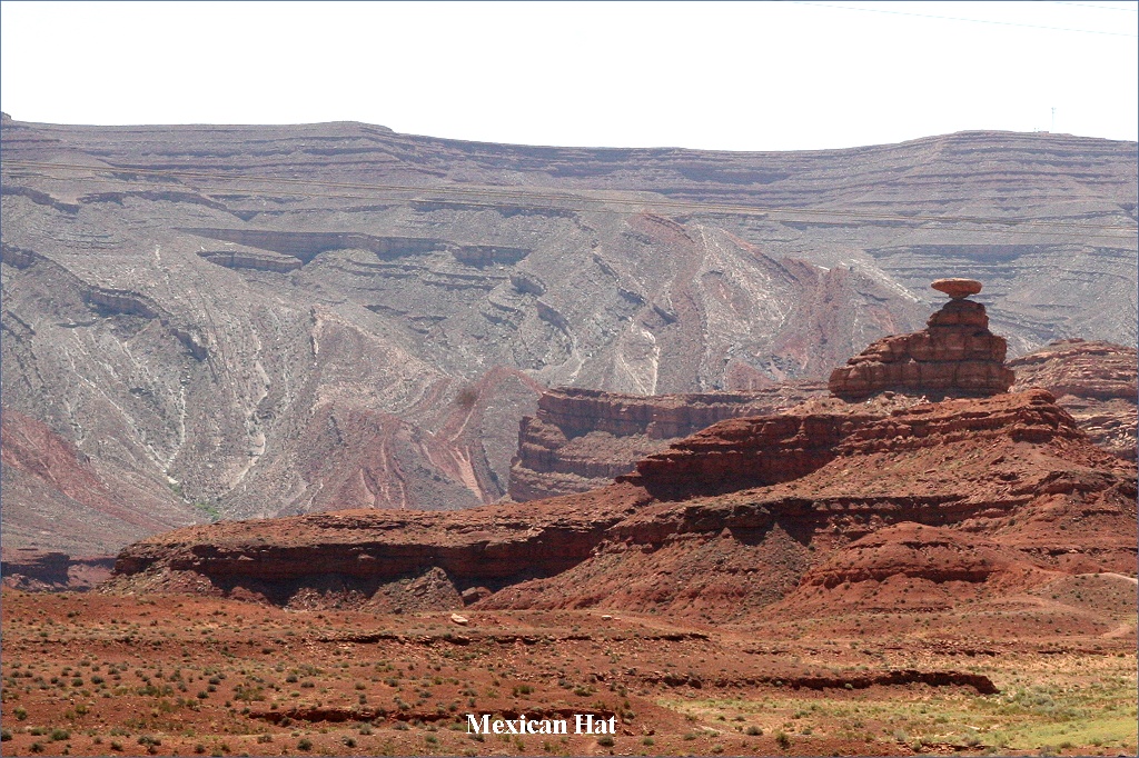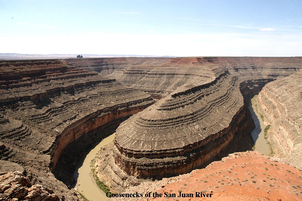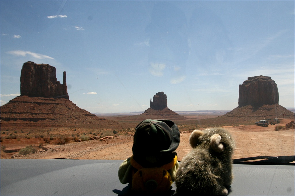 Nach circa 2 Stunden kurz vor Mexican Hat (der Ort trägt seinen Namen nach einem Felsen, der die Form eines mexikanischen Sombreros hat) bogen wir ab zu einem kurzen 8 km langen Abstecher zu den "Goosenecks of the San Juan River". Hier schlängelt sich der San Juan River in grandiosen Schleifen 300 m tief durch einen riesigen Canyon, sehr eindrucksvoll! Tomoko und ihr Vater blieben in respektvoller Entfernung vom Abgrund stehen. Dann ging es weiter ungefähr 25 km und wir sahen die aus zahlreichen Filmen bekannte Szenerie des Monument Valleys vor uns liegen. Ein wirklich beeindruckendes Panorama! |