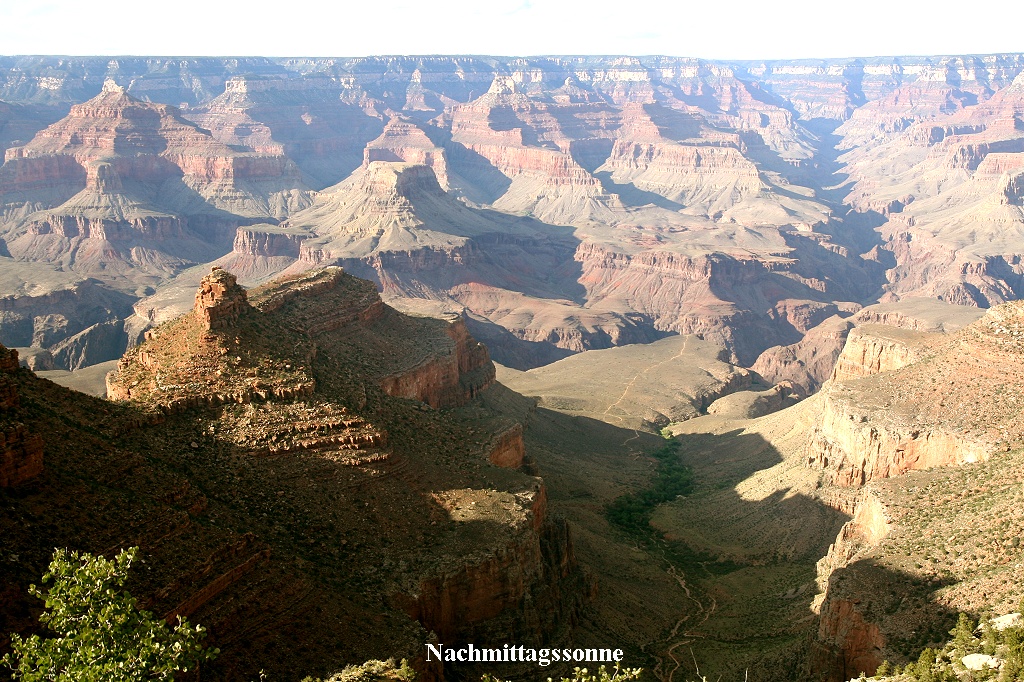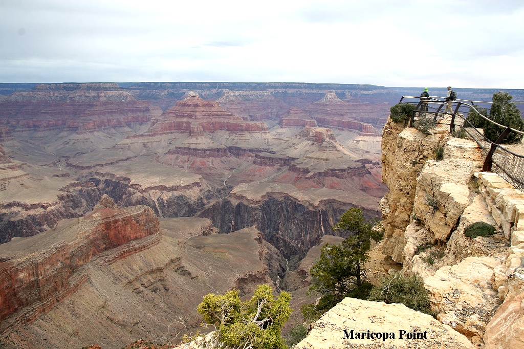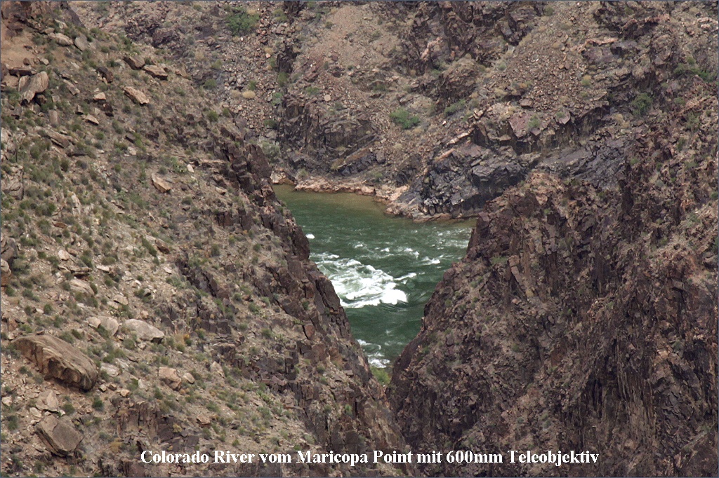 Wir wanderten also vorsichtig den Rim Trail am oberen Rand des Grand Canyons weiter bis zum Maricopa Point. Von hier aus war die Aussicht grandios, man konnte sogar ein winziges Stück vom Colorado zwischen den Felsschluchten erblicken. |