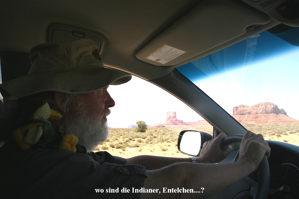 Wir befanden uns nun im Navajo Indianergebiet. Der Eintritt für uns vier kostete 20 $, und so fuhren wir ein Stück weit hinein über eine äußerst holprige Sand- und Steinpiste. Die Sonne schien heiß vom Himmel. |