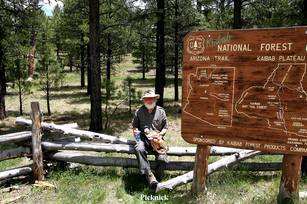 Also fuhren wir wieder zum Canyon zurück und hatten das große Glück, dass gerade als wir dort ankamen, drei Kondore majestätisch über unseren Köpfen kreisten. Leider verlor Tomoko beim Fotografieren die Sonnenschutzblende ihrer Kamera, die in den Grand Canyon fiel. So ein Pech! Nach gut 10 min waren die Kondore verschwunden und wir beschlossen, an den Tisch von gestern zurückzukehren und dort wieder ein Picknick zu machen. Danach machten wir einen Spaziergang durch den nahen Pinienwald, doch von den gesuchten Abert-Squirrels sahen wir leider keins. Plötzlich fiel Tomokos Mutter auf, dass sie ihre mit einem roten Band am Hals befestigte Brille vermisste. Sorgfältig suchten wir den gesamten Weg wie auch den Picknickplatz ab, von der Brille jedoch keine Spur. Es war auch keine Brille bei der Lodge abgegeben worden, sie blieb verschwunden. Da ein Gewitter heraufzog und die ersten Donnerschläge ertönten, fuhren wir gegen 14:30 Uhr zurück zum Hotel, um uns ein wenig auszuruhen. Um 17:00 Uhr war es wieder sonnig. Wir wollten versuchen die Kondore nochmals zu beobachten, aber als wir am Rim ankamen, sahen wir sie leider nicht mehr. |