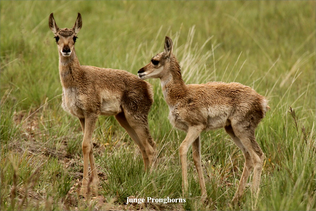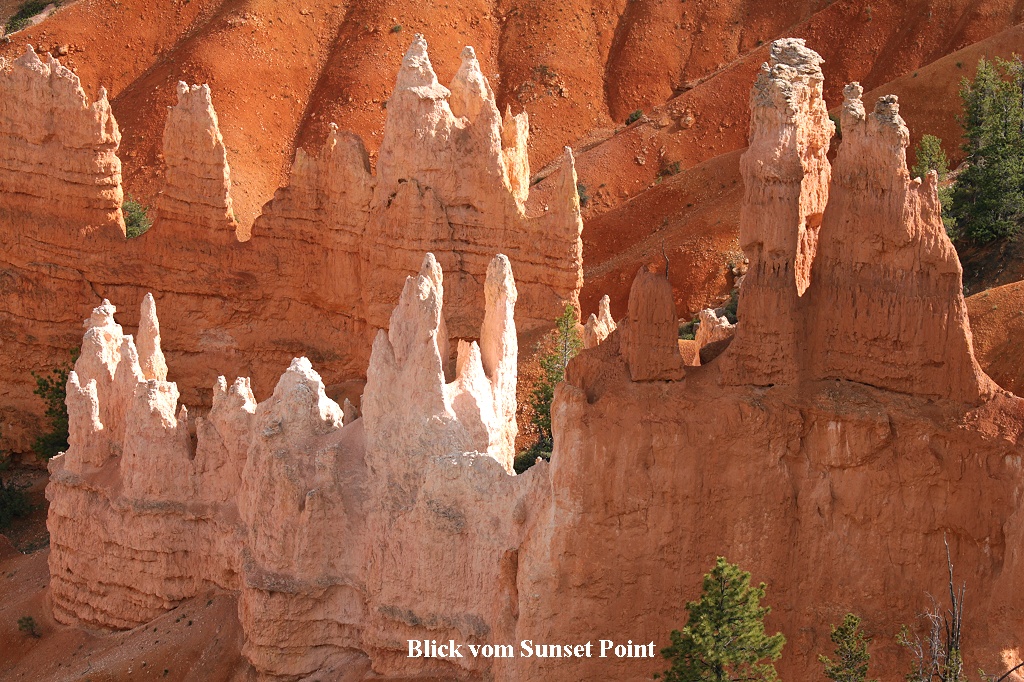 Trotz der etwas anstrengenden 460 km Fahrt machten wir uns gegen 17:00 Uhr bei herrlicher Spätnachmittagssonne auf den Weg zum Bryce Canyon. Gleich am Eingang konnten wir auf einer Wiese drei kleine Pronghorns herumspringen sehen. Ihre Eltern grasten ruhig in der Nähe. Wir parkten unser Auto am Sunrise Point und wanderten von hier am Canyonrand entlang zum Sunset Point. Der Bryce Canyon im Abendlicht der tiefstehenden Sonne sah prächtig aus. Selbst Tomoko vergaß ihre Höhenangst und war begeistert. |