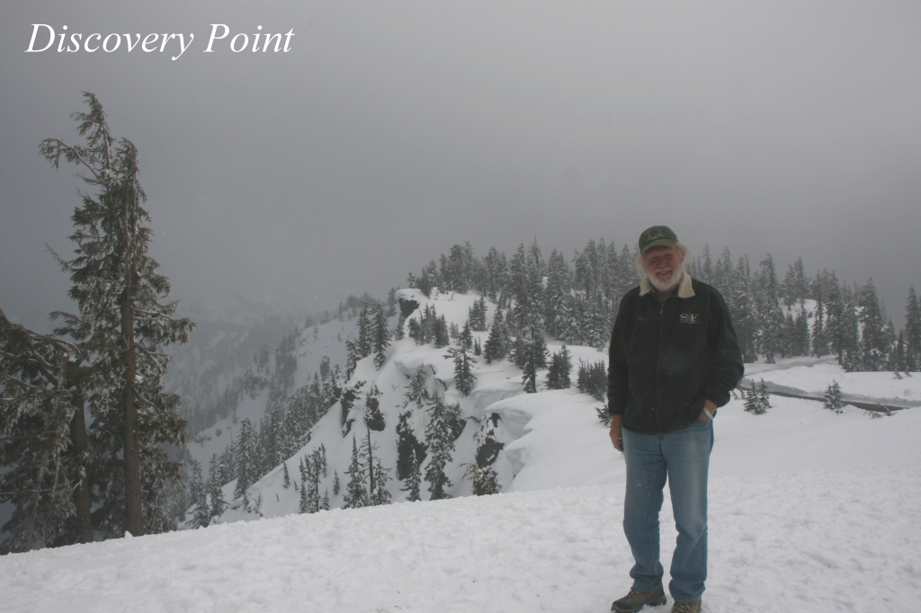 Da wir noch weitere Nationalparks auf dieser Reise besuchen wollten, kauften wir für 80,- $ einen Jahrespass für alle USA-Nationalparks. Die letzten 4 Meilen bis zum Kraterrand gingen steil nach oben bis auf eine Höhe von 2177 m. Die Schneewand rechts und links war stellenweise 3 bis 4 m hoch. Es schneite leicht, doch immer wieder lugte auch die Sonne zwischen den Wolken hervor. Oben angekommen war es zunächst schwierig einen Parkplatz zu bekommen. Nur wenige Plätze waren geräumt, die restlichen lagen unter meterhohem Schnee begraben. Wir gingen zu Fuß bis zum Kraterrand. |