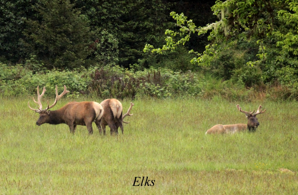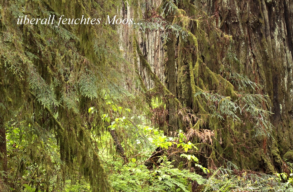 Auf einer Wiese sahen wir eine Gruppe Elks liegen, ein kurzes Stück weiter eine weitere. Es regnete jetzt wirklich heftig, so dass wir weiterfuhren. Trotz Regens versuchte ich noch ein paar Fotos von den riesigen Bäumen zu machen, was bei diesen Wetterverhältnissen nicht einfach war. Nach ca. 30 min verlief die Straße wieder abwärts. Je weiter wir nach unten Richtung Klamath River kamen, umso heller wurde es, bis plötzlich wieder die Sonne vom blauen Himmel strahlte. Die Regenwolken hingen richtig fest im Gebirge, anscheinend regnet es oft hier. Die Bäume waren teilweise mit dichtem feuchten Moos überzogen. |