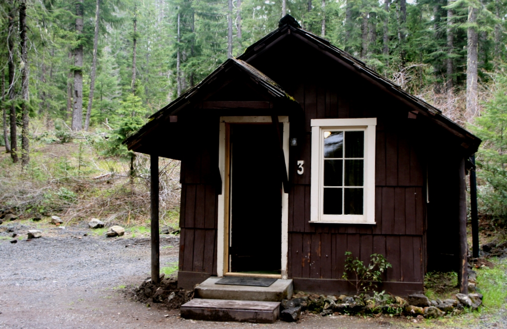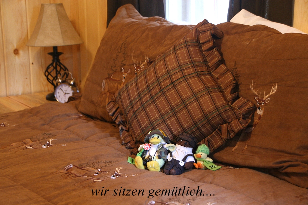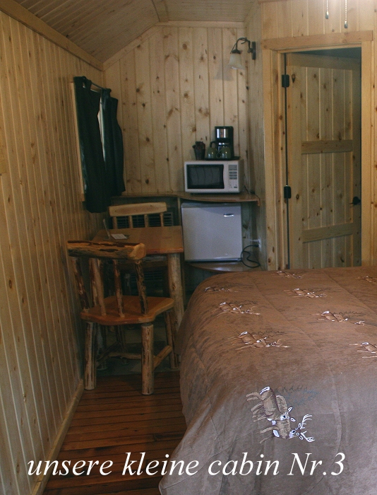 Ein kleines Eichhörnchen, ein Chipmunk, suchte am Boden nach Futter. Nun war es fast 15.00 h und wir gingen zur Rezeption um den Zimmerschlüssel für unsere kleine Holzhütte (Nr.3) in Empfang zu nehmen. Diese sah von außen etwas heruntergekommen aus, war aber innen sehr geschmackvoll eingerichtet. |