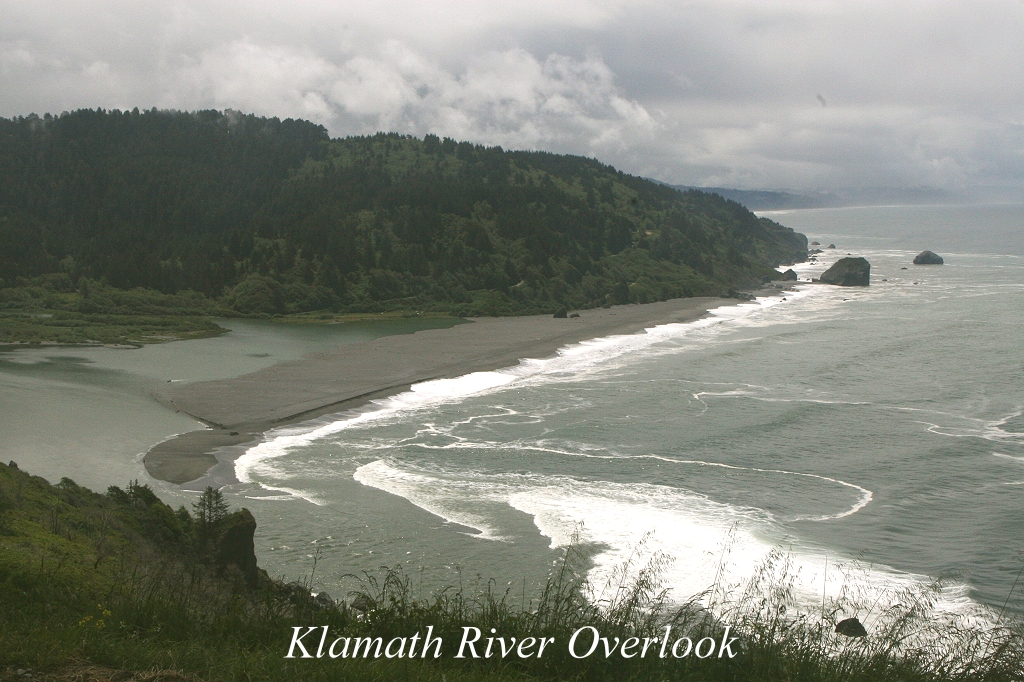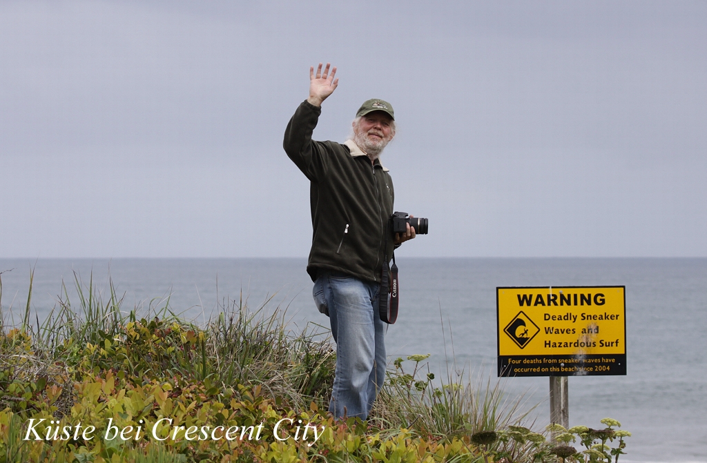Kurz hinter der Brücke über den Fluss zweigte eine kleine Straße ab, die auf eine Anhöhe führte (Klamath River Overlook), von der man aus ca. 200 m Höhe eine fantastische Aussicht über die Bucht und den blauen Pazifik hatte. Da wir Hunger verspürten, aßen wir erst einmal unsere kurz zuvor gekauften Sandwiches. Auch die leckeren Kirschen, die Tomoko an einem Stand gekauft hatte, schmeckten vorzüglich, obwohl einige davon sehr merkwürdig verformt waren. Wir konnten einige Robben in der wilden Brandung erkennen sowie zahlreiche Kormorane. Auch ein bisher für uns noch unbekannter Vogel war im Spektiv zu erkennen, ein "Pigeon Guillemot". Plötzlich entdeckte einer der Umstehenden weit draußen auf dem Ozean einen Wal und gleich darauf einen zweiten. Sie schwammen in 1 - 2 km Entfernung. Im Spektiv konnten wir deutlich beobachten, wie sie immer wieder kurz auftauchten und beim Ausatmen kleine Wasserfontänen in die Luft bliesen, ein sehr eindrucksvolles Erlebnis. Wir blieben etwa eine Stunde dort, dann ging es gegen 13.00 h weiter. Bis Crescent City führte die Straße am Pazifik vorbei. |