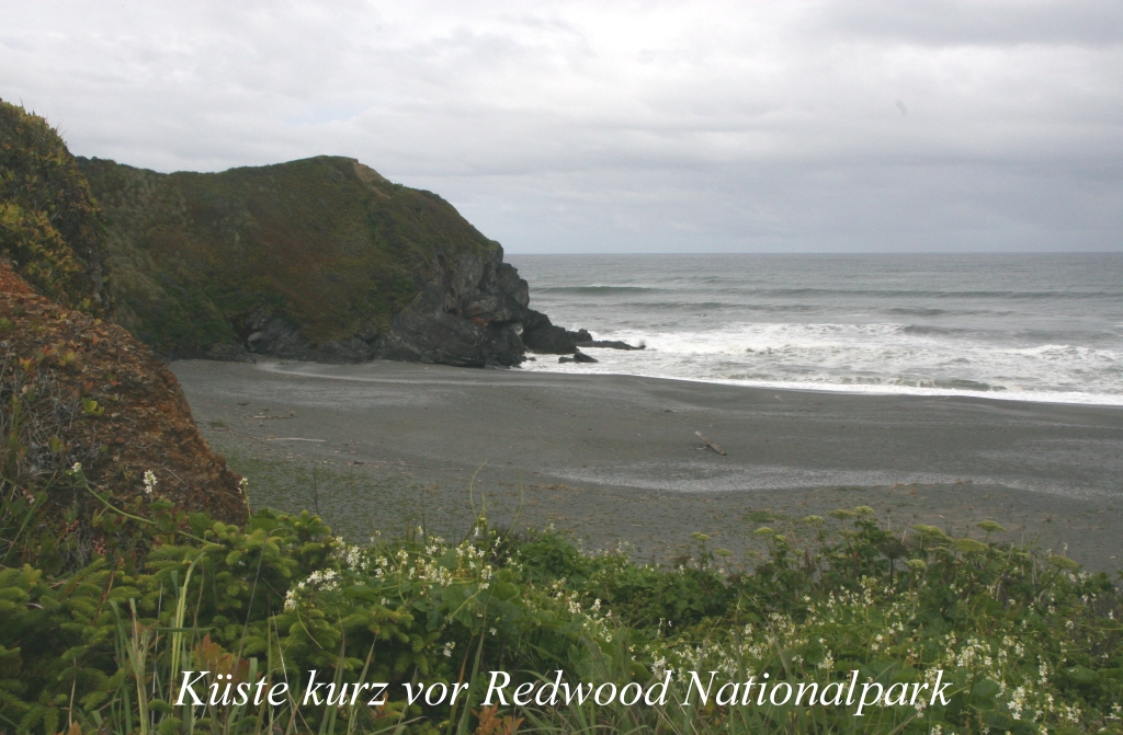 Um 5.30 h wurden wir wach. Der Blick aus dem Fenster verhieß nichts Gutes, in der aufkommenden Morgendämmerung tröpfelte der Regen aus wolkenverhangenem grauen Himmel. Also doch, das angesagte Schauerwetter mit kalter Luft hatte uns erreicht. An der Rezeption machte man uns Hoffnung, dass es gestern genauso war, später aber das Wetter wesentlich besser wurde. Na, schauen wir mal…. Das angebotene Frühstück war recht gut, besonders die Waffeln mit Sirup schmeckten uns. Wir blieben anschließend noch etwas im Zimmer, verbrachten die Zeit bis zur Abfahrt mit Zeitung lesen und Internet schauen. Tomoko arbeitete weiter an ihrer schon vor einigen Tagen angefangenen Übersetzung eines gut analysierenden Spiegel-Artikels über die Katastrophe von Fukushima. Gegen 8.15 h brachen wir endlich auf. Der Redwood NP war unser Ziel für heute. Hier stehen die höchsten Bäume, die es auf der Welt gibt. Diese werden bis zu 2000 Jahre alt und bis zu 122 m hoch. Es regnete nicht mehr. |