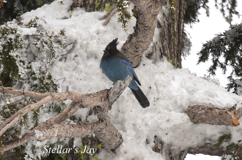Auf dem Weg konnten wir mehrere Grey Jays, Clark´s Nutcracker und Stellar´s Jay beobachten. Noch ein kleiner rutschiger Anstieg, dann war die großartige Aussicht frei auf den Crater Lake, der teilweise im nebligen Dunst lag, teilweise von der Sonne beschienen wurde. Es war ziemlich kalt, knapp über 0°. Nachdem wir ein paar Fotos gemacht hatten, gingen wir in den nahegelegenen Souvenir-Shop mit angeschlossenem kleinen Café und kauften uns etwas zu essen, Chili con Carne und ein Sandwich. So gestärkt gingen wir zum Auto zurück. Es waren immer mehr Touristen gekommen, die in einer langen Schlange darauf warteten, einen Parkplatz zu kriegen. Die Straße, die um den ganzen Vulkankrater herumführt, ist im Winter geschlossen, nur ein kleiner 1 km langer Abschnitt war offen. |
