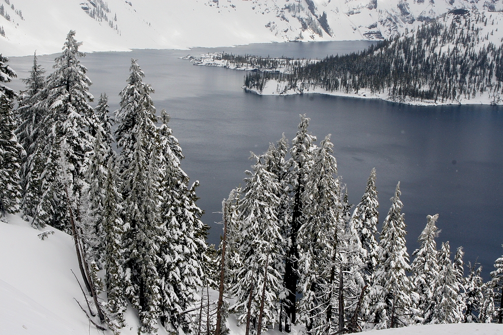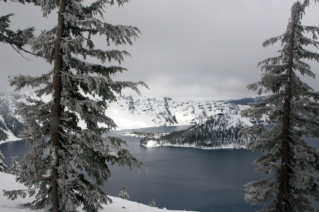 Heute schliefen wir beide bis 6.30 h. Gemütlich tranken wir schon mal einen Kaffee. Draußen regnete es in Strömen, also keine Hektik, in Ruhe duschen, einpacken und Internet einschalten. Da wir gestern Abend nichts mehr gegessen hatten, verspürten wir schon großen Hunger. Als es dann endlich 8.00 h war, gingen wir schnell auf die andere Straßenseite ins Café zum Frühstück. Unterdessen ging der Regen in heftigen Schneefall über. Obwohl wir hier auf etwa 1000 m Höhe waren, blieb der Schnee Gott sei Dank nicht liegen. Gegen 10.00 h war es dann soweit, noch ein paar Fotos und wir machten uns auf den Weg nach Klamath Falls. Die Straße führt ziemlich nahe beim Crater Lake vorbei, wobei sie auf über 1900 m ansteigt. Es schneite wieder leicht und diesmal blieb der Schnee auch auf der Straße liegen. Zeitweise waren nur 2 schmale Streifen Asphalt frei. |