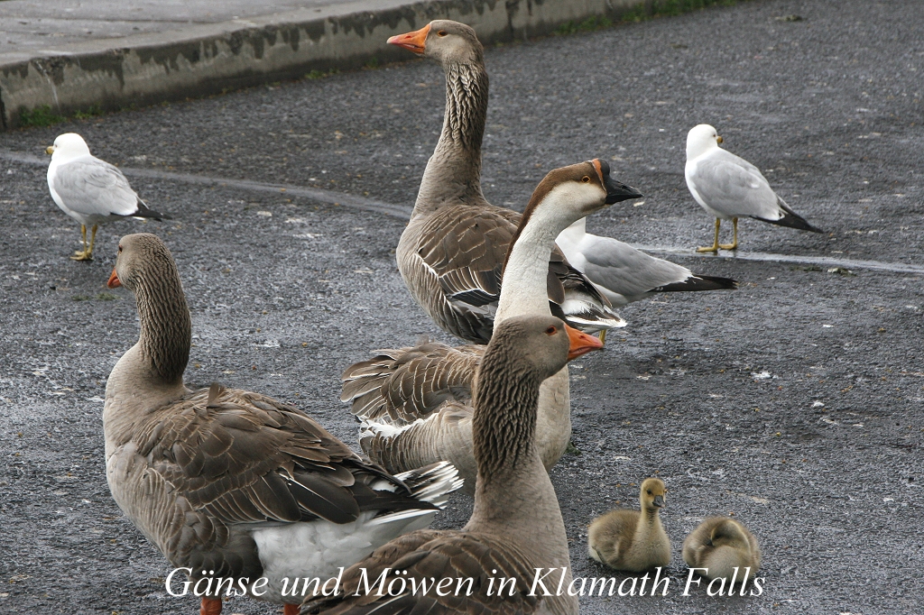 Bei der Einfahrt in die Stadt sahen wir auf einem Parkplatz eine große Gruppe Gänse mit Jungen sowie zahlreiche Möwen, die sich auch durch ankommende Autos nicht stören ließen. In einem Supermarkt ergänzten wir unsere Vorräte an Wasser und Bier und kauften noch ein paar Kleinigkeiten. So langsam verspürten wir Hunger, da kam uns ein "Sizzler-Restaurant" am Straßenrand gerade recht. An der reichhaltigen Salatbar aßen wir uns beide satt. Inzwischen war es 16.00 h geworden. Wir fuhren zum gebuchten "Best Western Hotel", wo wir ein sehr schönes geräumiges Zimmer bekamen. Tomoko kochte einen starken Kaffee. Das Internet, mit dem wir uns erst mal beschäftigten, war besonders schnell. So verbrachten wir zunächst mal einige Zeit gemütlich im Zimmer. Die Zeit verging auf diese Weise ziemlich schnell. Draußen wechselten nach wie vor kräftige Regenschauer mit kurzen Aufheiterungen ab. Also beschlossen wir heute nicht mehr weg zu gehen. Hunger hatten wir sowieso keinen mehr. Ich trank mit Entelchen noch ein Bier, bevor wir dann kurz nach 22.00 h schlafen gingen. |