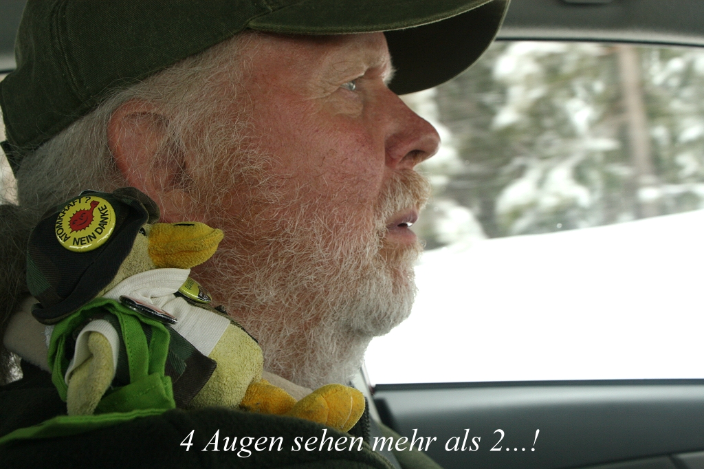 Wir schauten wieder den "Grebes" zu, die scheinbar regungslos auf der Wasseroberfläche dahintrieben. Beide waren wir etwas müde, ich zusätzlich noch etwas "muffig", als plötzlich Bewegung auf dem See entstand. Zwei Western Grebes erhoben sich gleichzeitig und begannen einen leider nur wenige Sekunden dauernden Hochzeitstanz. Für ein Foto reichte es leider nicht, doch die Tatsache, dass wir das gesehen hatten, machte uns auf einen Schlag munter. Ich stieg aus, brachte meine Videokamera in Stellung und wartete. Nichts geschah, alles wieder ruhig. Tomoko ging mit ihrer Kamera auf die andere Seite des Parkplatzes, doch auch da blieb es ruhig. Plötzlich hörte ich in etwa 70 m Entfernung rechts von mir wieder ein lautes platschendes Geräusch. Wieder hatten 2 Grebes für einige Sekunden ihren Tanz aufgeführt, für ein Video leider zu schnell beendet. Wir warteten noch eine halbe Stunde, vergeblich, nichts geschah mehr. Wir fuhren 15 min nach Norden am Seeufer entlang bis zu der Stelle, wo wir gestern den Adler gesehen hatten. Der kam heute nicht, dafür waren wieder zahlreiche Pelikane, Grebes, Seeschwalben, Schwalben, Reiher und weitere Singvögel anwesend. Wenn die Sonne mal kurz zum Vorschein kam, war es angenehm draußen zu stehen. Leider verschwand sie immer wieder viel zu schnell hinter dichten Wolken, aus denen immer wieder Schnee und Hagel grieselte. Gegen 15.00 h bekam ich langsam Hunger. Wir fuhren wieder zum gleichen Restaurant "Sizzler" wie gestern zurück und bedienten uns an der reichhaltigen Salatbar. Zusätzlich nahm ich mir auch einen Teller Spaghetti mit Fleischklößchen. So gestärkt fuhren wir zum Hotel zurück. Tomoko nahm die Treppe anstatt des Aufzugs. Als ich ihr etwas zu schnell folgte, verspürte ich plötzlich Extrasystolen. Schnell legte ich mich im Zimmer aufs Bett. Gekühlt mit einem nassen Handtuch ging es mir aber bald wieder besser. Trotzdem war es irgendwie beunruhigend, dass meine Kondition offensichtlich miserabel ist, muss mich doch mehr bewegen. Tomoko litt unterdessen an Migräne. Aus diesem Grund verzichtete sie darauf ihren Laptop einzuschalten. Wir faulenzten einfach für den Rest des Tages, schauten diverse Kanäle im TV, die alle schrecklich waren (bis auf die Nachrichten im Wetterkanal) , ich schrieb an meinem Tagebuch, Tomoko las etwas usw…. Morgen werden wir wieder Richtung Süden fahren, hoffentlich hat das kalte Wetter dann bald ein Ende…. |