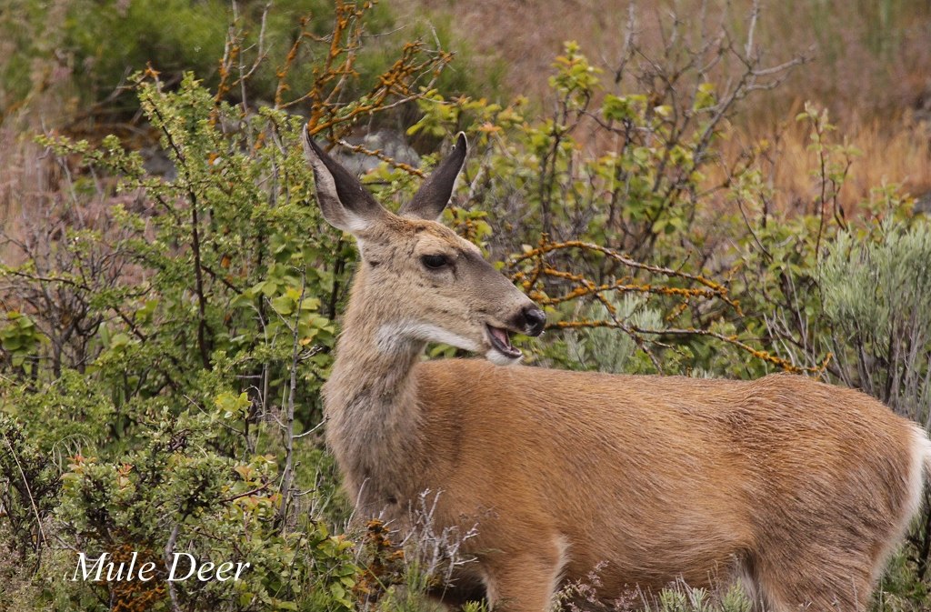 Plötzlich wurde Tomoko sehr müde , also kehrten wir um. Zurück am Upper Klamath Lake wachte Tomoko pünktlich wieder auf. Ich musste zwischenzeitlich einige Male sehr langsam und vorsichtig fahren, da der Hagel auf der Straße liegen blieb. Bei der Ankunft am See konnten wir ein Reh (Mule Deer) beobachten, das die umstehenden Büsche nach frischem Laub absuchte. |