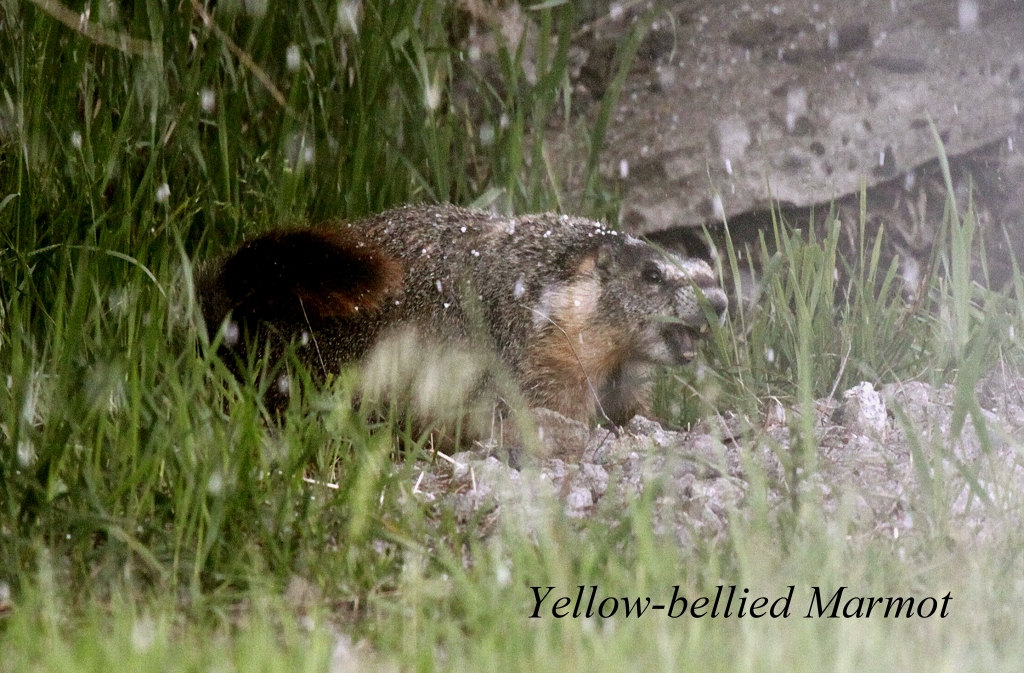 Wir wollten einen kleinen Spaziergang am Fluss Klamath entlang machen, doch ein plötzlich einsetzender Hagelschauer ließ uns zum Auto zurückgehen. Beim Wegfahren entdeckte Tomoko hinter einem Zaun ein Tier, das aussah wie eine Mischung aus Hamster und Murmeltier. Wir identifizierten es schließlich als Yellow-bellied Marmot. Es war schwierig durch den Zaun, noch dazu bei prasselndem Hagel, ein brauchbares Foto zu machen. Schließlich klappte es einigermaßen. Nun fuhren wir ca 20 Meilen nach Süden in ein Gebiet, das "Lower Klamath Wildlife Refuge" heißt. An verschiedenen Stellen konnten wir in der flachen Prärielandschaft weiße Pelikane, diverse Enten (u.a. Canvasback) und verschiedene Tauchvögel beobachten. |