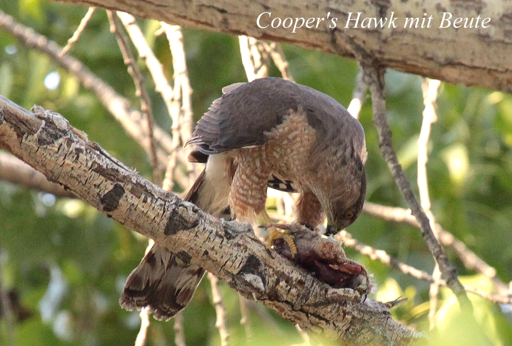 Als ich mich umsah, sah ich noch drei weitere Eulen. Wie wir später von einem Ranger hörten, sind es 4 Jungtiere einer Eulenart, die normalerweise in dieser Gegend nicht häufig ist. An einer Abzweigung zum Mesquite-Trail entschieden wir uns wegen der enormen Hitze für die kürzere Variante zurück zum Eingang. Auf einem trockenen Baumstamm ruhten wir uns ein wenig aus, als plötzlich ein Summer Tanager und ein Cooper`s Hawk über uns hinwegflogen. Beim Anblick des Falken wurde Vater, der bis dahin etwas müde da gesessen hatte, auf einmal wieder munter. Zurück am Parkplatz gegen 16.00 h beschlossen wir noch eine Stunde hier zu bleiben. Wir sahen uns um, da flog ein Raubvogel heran und blieb auf einem Ast sitzen. Es war wieder ein Cooper`s Hawk. Langsam schlichen wir uns fotografierend immer näher, bis wir dem Falken wohl zu nah kamen und er wegflog. |