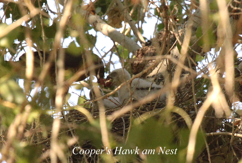 Wir blieben am Eingang des kleinen Vogelschutzgebietes stehen. Hier hatte man an einer Leine 10 kleine Futterstellen angebracht, die von verschiedenen Vögeln intensiv genutzt wurden. Der freundliche Ranger hatte uns angeboten, auf seinen dort stehenden Stühlen Platz zu nehmen. Es kamen : Lesser Goldfinch, House Finch, Hooded Oriole, Hummingbirds, Summer Tanager u.a. Ein Erdhörnchen sammelte die Futterreste, die von oben auf den Boden fielen. Gegen 17.00 h wurde ich müde und ging zum Auto zurück. Inzwischen hatte der Ranger Tomoko und ihren Eltern ein Nest gezeigt, in dem ein Cooper`s Hawk seine 4 Jungen fütterte. |