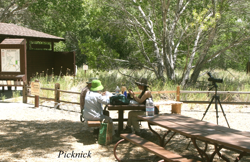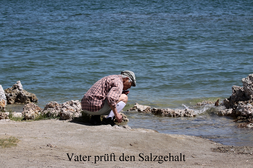 Nach dem Frühstück um 7.30 h fuhren wir um 9.10 h ab Richtung Norden. Das Wetter war wieder schön sonnig und warm. Unsere erste Station war der Mono Lake, ein großer See, dessen Wasserstand uns diesmal höher erschien als bei unserem letzten Besuch vor 5 Jahren. Früher wurde hier Wasser zur Versorgung von Los Angeles abgepumpt. Seit ein paar Jahren hat man damit aufgehört und lässt den Wasserspiegel langsam wieder ansteigen. Im Laufe der Jahre haben sich hier eigenartige meterhohe Kalkfelsen (Tufas) gebildet. |