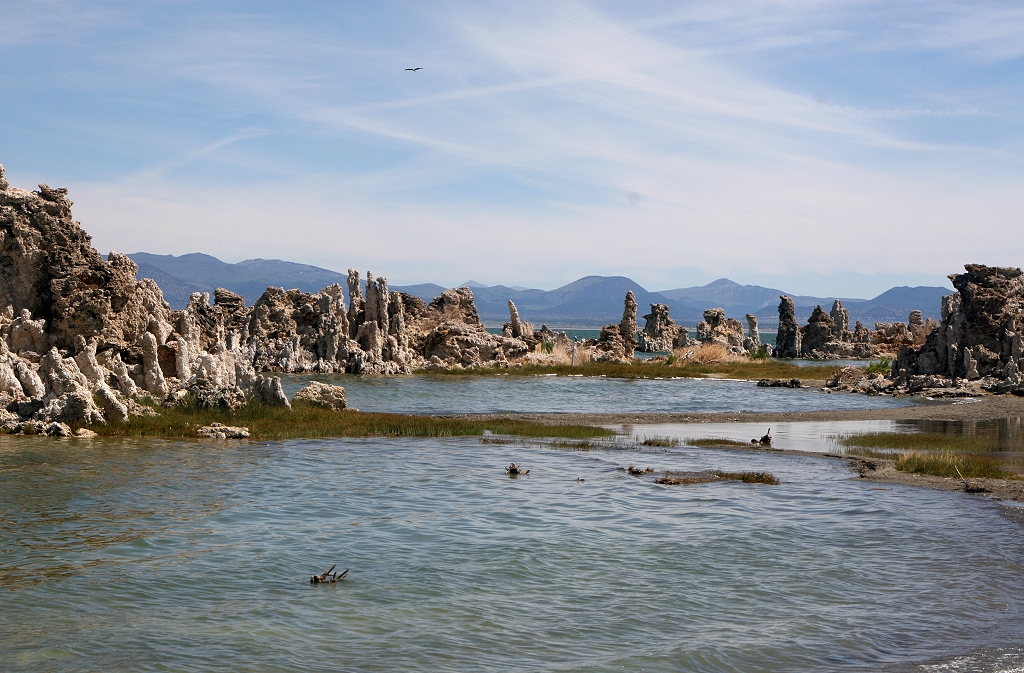 Wir fuhren an den südlichen Zugang zum See (South Tufa). Ein 800m langer Trail führte vom Parkplatz zum Seeufer. 3 Ospreys (Fischadler) kreisten in der Luft. Am Ufer standen junge Leute, die mit Spektiven zwei Osprey-Nester in den Kalkfelsen anvisiert hatten. |