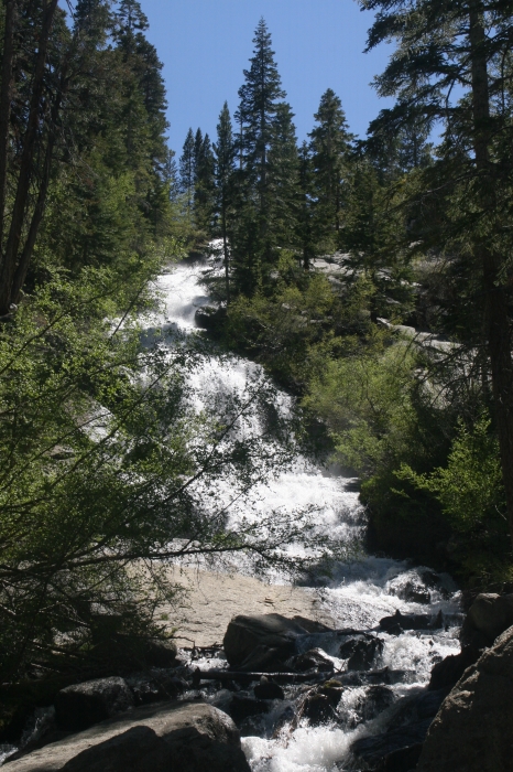 Die letzten 10 km schlängelte sich die Straße ziemlich steil nach oben. Als wir aber endlich den Endpunkt erreicht hatten, boten sich herrliche Ausblicke in die Bergwelt. Die Temperatur war in der Höhe sehr viel angenehmer als im Tal. Schmelzwasser stürzte über einen Wasserfall rauschend ins Tal hinab. |