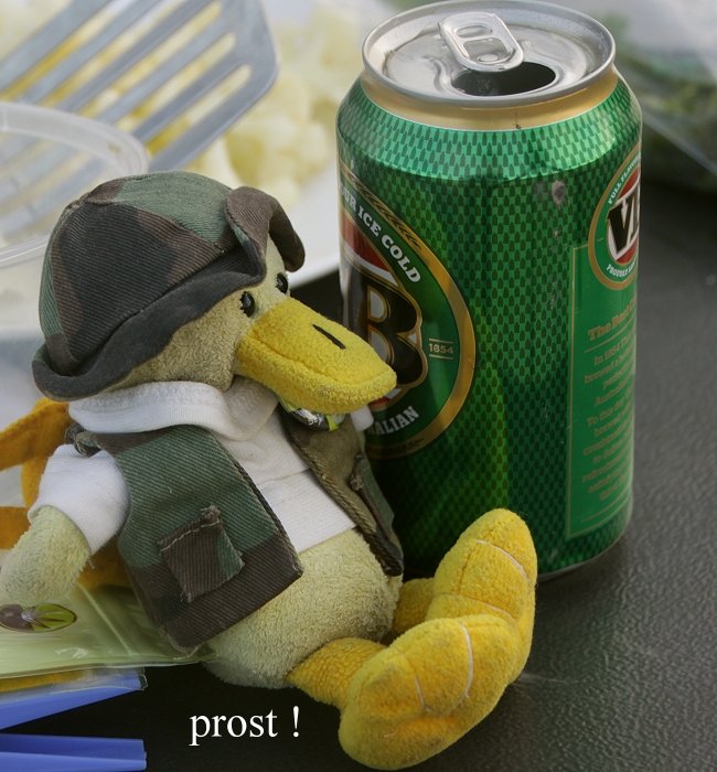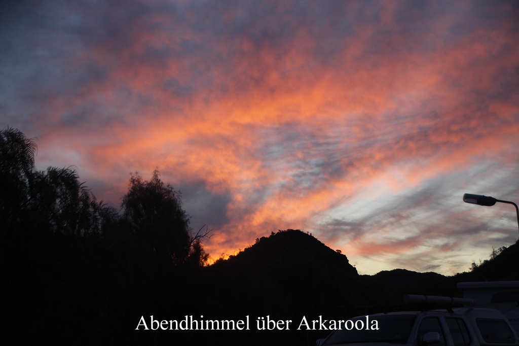 Um 15.15 Uhr erreichten wir die Abzweigung nach Arkaroola. Von hier aus waren es noch 32 km bis zum Ziel, das wir um 15.45 Uhr erreichten. Insgesamt waren wir 229 km gefahren, davon 152 km auf unbefestigter Piste. Auf dem dortigen relativ einfach eingerichteten Campingplatz fanden wir einen schönen Platz mit Blick in die nahen Berge. Unser Auto war über und über mit orangerotem Staub bedeckt. Durch die hintere Tür war der Staub auch ins Innere gelangt und hatte alles mit einer feinen Staubschicht bedeckt, die ich zunächst mal wegputzen musste. Tomoko begann sogleich das Abendessen zu kochen. Heute gab es gebratene Glasnudeln in Limetten-Oyster-Sauce mit Gemüse, für mich noch angereichert mit einigen Fleischstückchen. Ich trank mit Entelchen ein Bier, so machten wir Mund und Schnabel frei von Staub. Es war nicht so kalt wie die letzten Abende, so dass wir draußen essen und der untergehenden Sonne zuschauen konnten. Währenddessen färbte sich der Himmel allmählich dunkelrot.