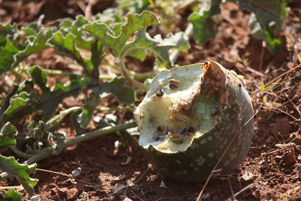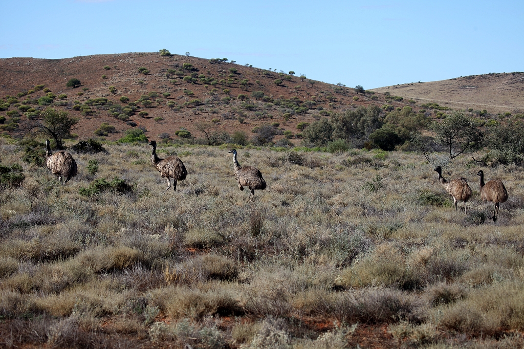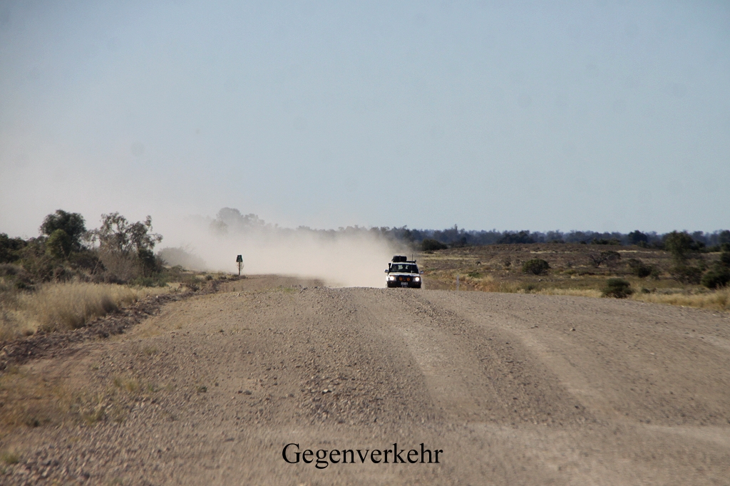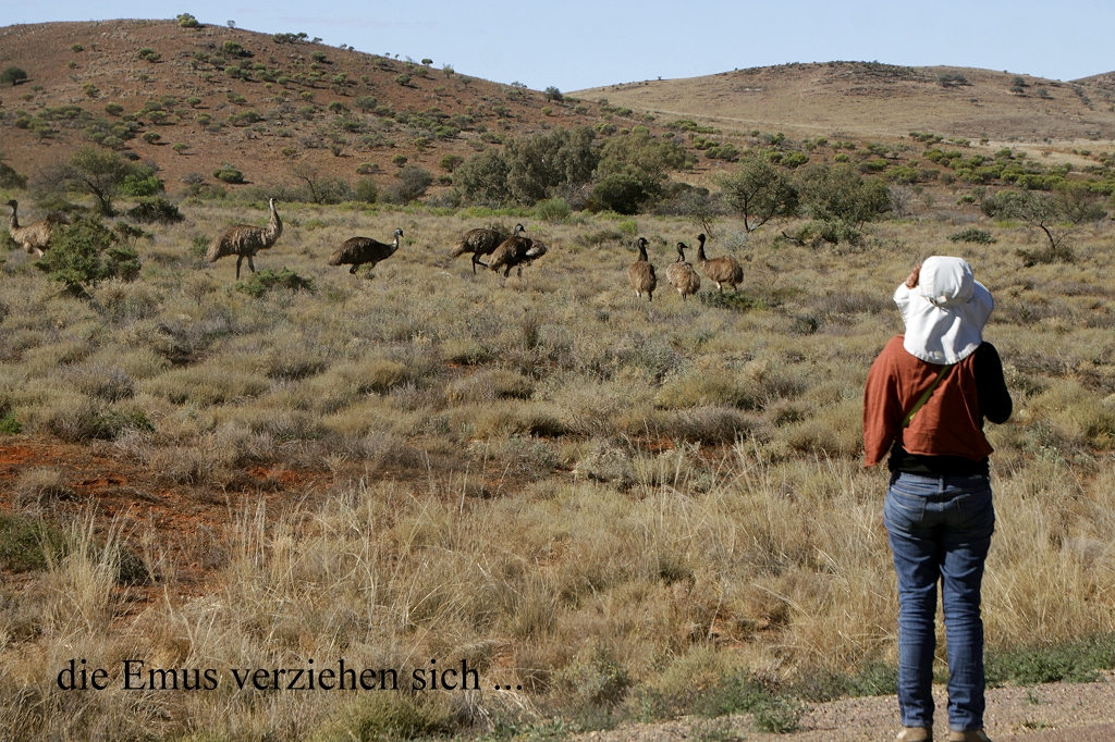 Kurze Zeit später kreisten zwei Adler (Wedge-tailed Eagle) in der Luft. Dann nochmals rund zehn Emus und noch zwei Adler. Mehr Adler und Emus folgten noch im weiteren Verlauf der Strecke. An einer Stelle haben wir das Geheimnis der am Straßenrand liegenden Kürbisse gelüftet. Dies beschäftigte uns schon seit ein paar Tagen. Mehrfach hatten wir neben der Straße kleine Kürbisse liegen sehen und wir fragten uns, ob wohl irgendjemand diese weggeworfen hatte. Doch es handelt sich ganz einfach um eine wilde Kürbisart.