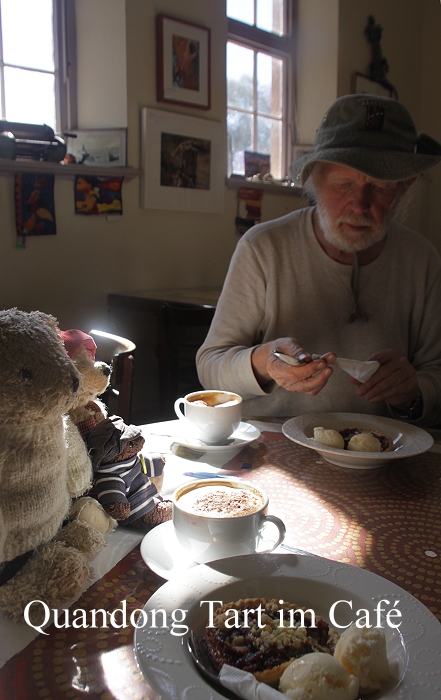 In Blinman machten wir eine kleine Kaffeepause im Wild Lime Café, wo wir uns zusätzlich zum obligatorischen Cappuccino für ein Quandong-Törtchen mit Vanilleeis entschieden, köstlich. Quandong wird auch wilder Pfirsich genannt, schmeckt aber mehr nach Pflaume. Die Frucht ist nicht sehr ergiebig und daher ziemlich teuer. Wie uns die freundliche Café-Besitzerin, eine Deutsche, sagte, kostet sie im Einkauf ein Kilo dieser Früchte 66,- AUS$. Daher war der Preis von 7$ für ein Törtchen durchaus angemessen. Um 12.40 Uhr beendeten wir die kurze Pause, fuhren 2 km zurück und bogen dann auf die 152 km lange unbefestigte Straße nach Arkaroola ab. Auf dieser Strecke gibt es keinerlei andere Ortschaft mehr, nur staubige Piste. Gleich zu Anfang identifizierten wir einen jungen Kuckuck (Fan-tailed Cuckoo).
