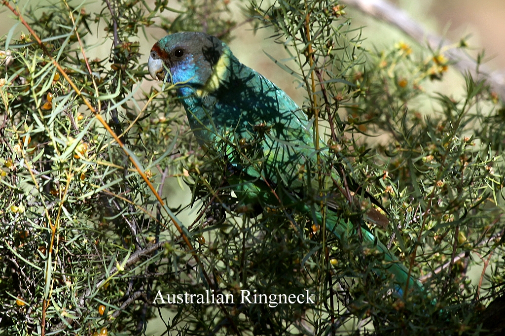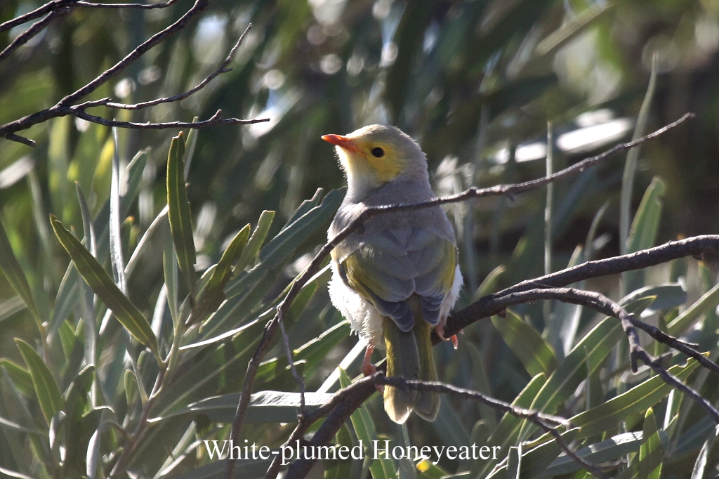 Ich war froh als ich um 11.20 Uhr am Auto angekommen etwas Wasser trinken konnte, meinen Rucksack mit der Wasserflasche hatte ich nämlich nicht mit auf die Wanderung genommen. Wir fuhren zum Visitor-Center zurück. Dort kauften wir 2 Cappuccinos und setzten uns damit in die Sonne vor den Eingang, wo ein paar Tische mit Stühlen standen. Wir hatten bei unseren Vorräten noch 2 Muffins gefunden, die wir zusammen mit einer Banane aßen. So blieben wir gemütlich eine Weile sitzen. Die Sonne schien ziemlich kräftig, so dass es uns bei 20° im Schatten doch ziemlich warm wurde in der prallen Sonne. Einige Vögel flogen umher: White-plumed Honeyeater, 2 Willie Wagtail, 2 Spiny-cheeked Honeyeater, 1 Zebra Finch, Australian Ringneck. |
