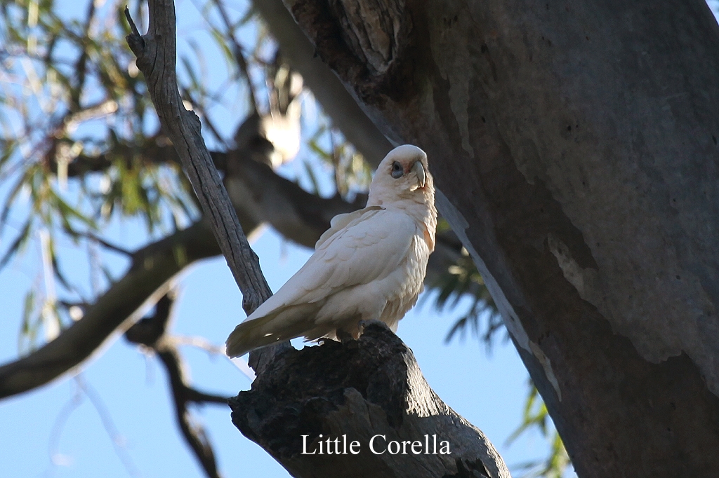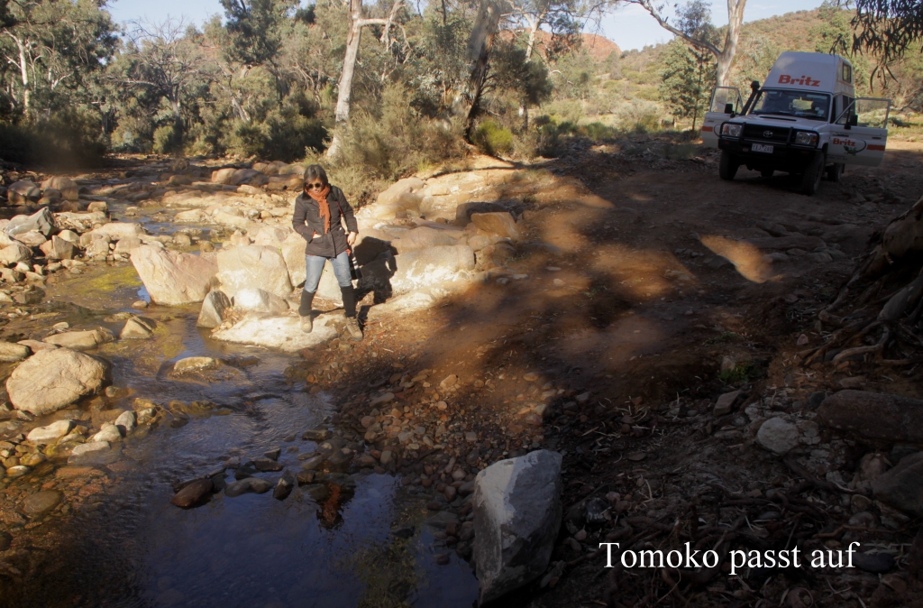 Ein zufällig vorbeifahrender Cross-Radfahrer(!!) klärte uns auf, dass wir an besagtem Wasserloch schon vorbeigefahren waren. Währenddessen entdeckte Tomoko hoch in einem Baum über uns 2 Little Corellas, eine weiße Kakadu-Art, die wir bisher noch nicht zu Gesicht bekommen hatten. Wir fotografierten ausgiebig, war doch auch die Umgebung sehr malerisch. Ein kurzes Video kann man hier sehen: Little Corella Dann wendete ich das Auto und wir fuhren ein kleines Stück zurück. |