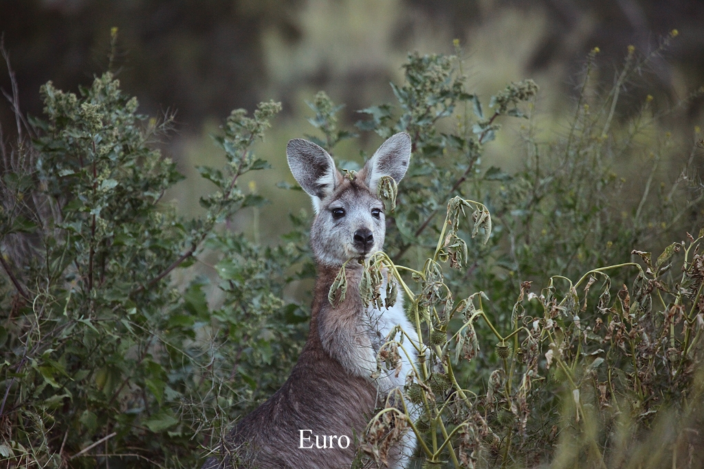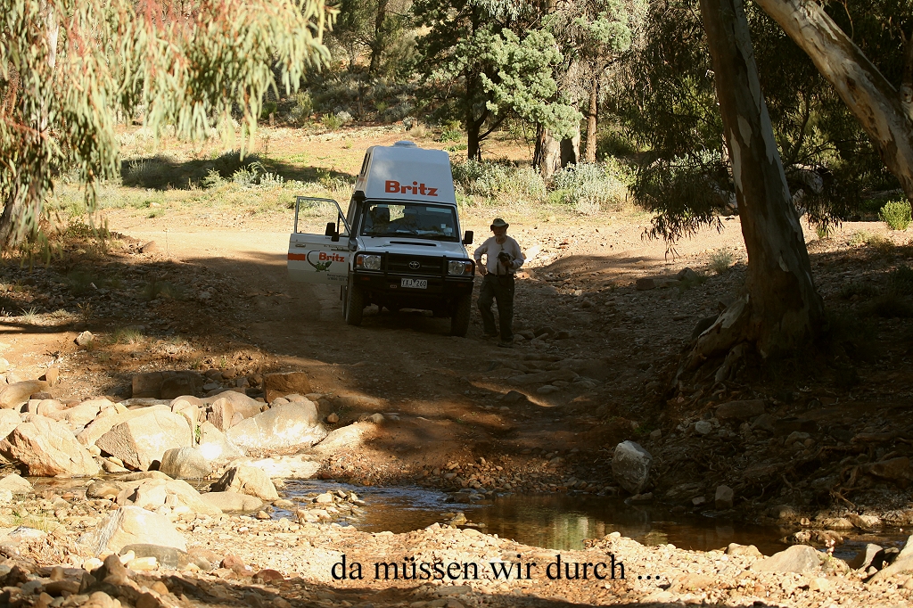 Ja, da war die Abzweigung zum Arkaroola Waterhole. Ein Warnschild wies darauf hin, dass die 1,5 km - Strecke nur mit Vierradantrieb befahren werden darf. Kaum war ich auf den Weg abgebogen, wusste ich auch warum. Dieser Weg war wirklich nicht mit einem normalen PKW zu schaffen. Also hielt ich an, verriegelte die Vorderradnaben manuell und schaltete zum erstenmal das Vierradgetriebe ein. Damit ließ sich die Piste tatsächlich bewältigen, auch für einen Neuling wie mich. Es war schon abenteuerlich, wie das Auto durch die tiefen Sandlöcher, über felsige Partien und dicken Steine schaukelte, aber die 8-Zylinder-Maschine ließ uns nicht im Stich. Einige Kängurus schauten uns zu, die meisten Euros, aber eins war wohl ein junges Red Kangaroo. |