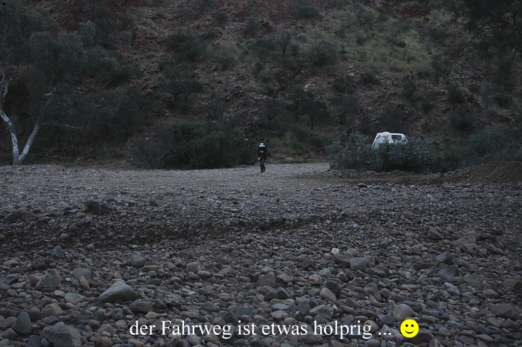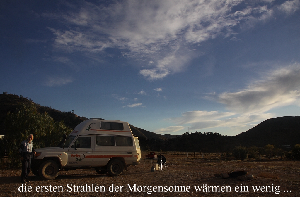 Wir kletterten aus unseren Schlafsäcken, öffneten die Hintertür unseres Autos und machten ein paar Fotos im zarten Morgenrot. Dann war Frühstück angesagt, das wir wieder im Inneren des Autos einnahmen, da die Außentemperatur gerade mal 2° betrug. Um 7.15 Uhr kam die Sonnenscheibe hinter den Bergen zum Vorschein und strahlte gleich etwas wohlige Wärme aus. Um 7.45 Uhr machten wir mal eine kleine Runde in die nähere Umgebung, doch es blieb ziemlich ruhig. Wir machten daraufhin unser Auto startklar und fuhren über eine äußerst holprige Wegstrecke zum 11 km entfernten Nooldonooldona Waterhole. |