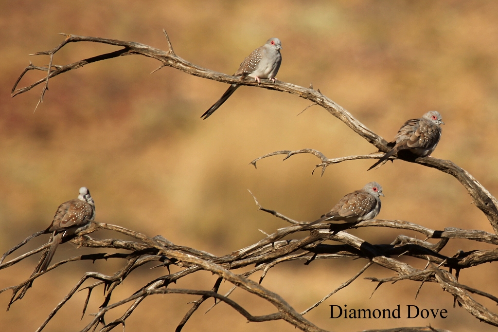 Dabei mussten wir wieder steinige Bachläufe vorsichtig durchqueren, die teilweise Wasser führten. An einer Stelle saß eine ganze Gruppe von Tauben (Diamond Dove), eine für uns neue Art, in einem Strauch. |