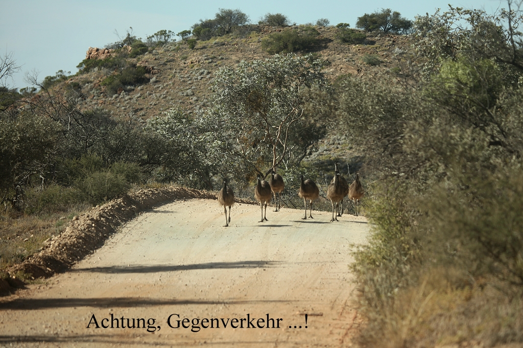 Tomoko mochte diese kalte abweisende Stimmung nicht besonders. Also fuhren wir wieder ein Stück zurück bis zu einer Abzweigung zu den Pinnacles, einer Hügelkette durch die ein Wanderweg führte. Auf dem Weg dahin begegneten uns ein paar Zebra Finches und Babbler (White-browed Babbler). 2 Australian Ringnecks kreuzten im Flug unseren Weg. Weiter sahen wir noch einige Grey-fronted Honeyeater und einen Falken (Nankeen Kestrel). Um 10.00 Uhr kam uns plötzlich unverhofft eine Gruppe von 8 Emus entgegen. Wir stoppten sofort. |