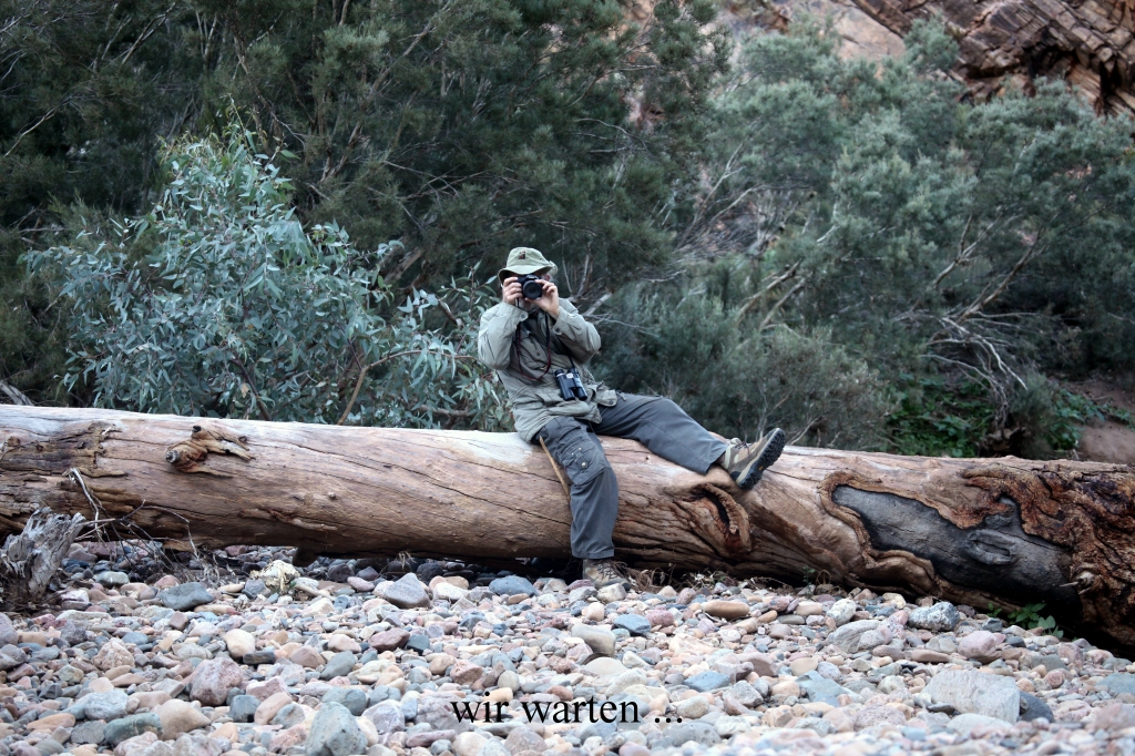 Gegen 16.00 Uhr kamen wir wohlbehalten am Wasserloch an. Als wir den Motor des Autos ausschalteten, war es nach der irren Schaukelei plötzlich totenstill. Wir verließen das Auto, gingen ein paar Schritte bis zum Wasserloch und setzten uns dort auf einen dicken liegenden Baumstamm. |
