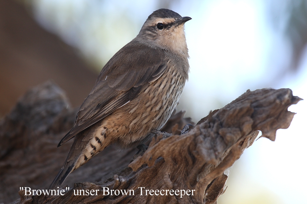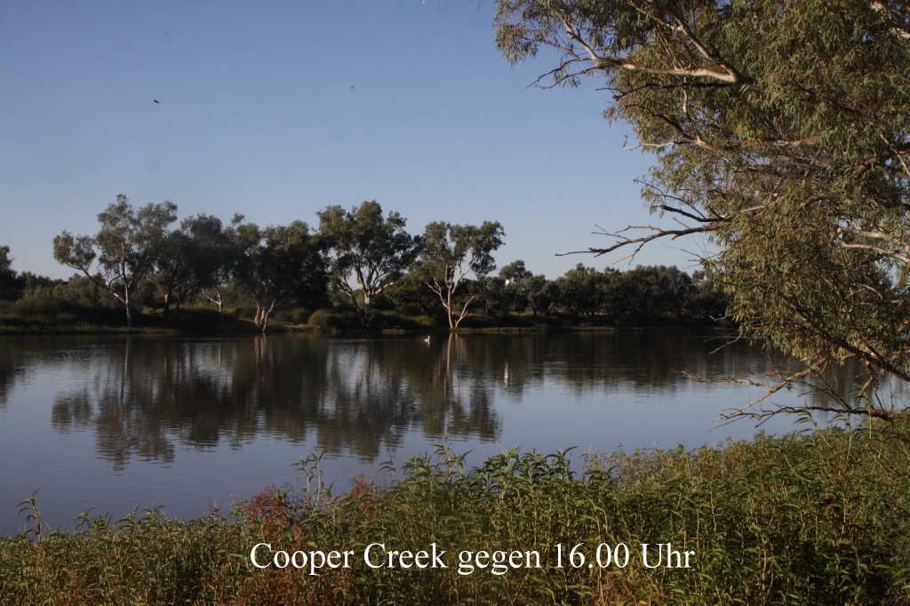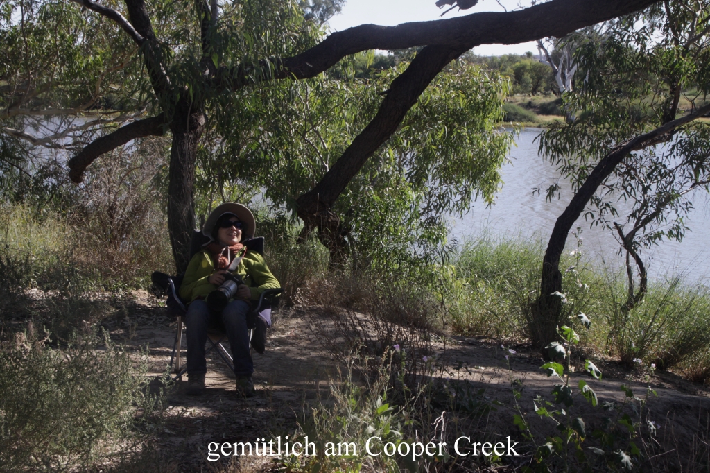 Diesmal schliefen wir beide sehr gut. Das erste Morgenlicht weckte uns um 6.30 Uhr. Da die Gegend hier flach ist, kroch die Sonne schon um 6.45 Uhr langsam über den Horizont und schickte ihre ersten Strahlen direkt in unser Zimmer. Da hielt es uns nicht mehr lange im Bett. Nach einer erfrischenden Dusche fingen wir an unsere Sachen zu packen. Um 7.30 Uhr gingen wir zum Frühstück. Offensichtlich waren wir heute die einzigen Gäste, so dass es kein Frühstücksbuffet gab, sondern man separat etwas bestellen konnte. Tomoko wählte die vegetarische Variante mit gebratenen Champignons und Bohnen, dazu ein Toastbrot. Ich entschied mich für die rustikale Form mit Rührei, Speck, Hash Browns (geröstete Kartoffeln), Bohnen sowie etwas Müsli mit Pflaumen und Weintrauben. Da die Portionen ziemlich umfangreich waren, schafften wir es kaum alles aufzuessen. So gestärkt bezahlten wir unsere Gesamtrechnung (2 Nächte, 1xDinner, 2x Frühstück) von 470,- $ , packten all unsere Sachen ins Auto und fuhren zum 14 km entfernten Cullyamurra Waterhole, um hier den Tag gemütlich am Fluss sitzend zu verbringen. Da der Cooper Creek mehr Wasser als normal führte, war von dem eigentlichen Wasserloch nichts zu sehen. Auch an der Stelle, wo wir gestern versuchten auf die andere Flussseite zu kommen, ist normalerweise links und rechts der Straße ein Wasserloch zu sehen, während die Durchfahrt trocken ist. Wir packten unsere Campingmöbel aus und beobachteten sitzend die Vögel, die immer wieder näher kamen. Besonders 2 Brown Treecreeper kamen immer wieder zu uns und saßen zum Greifen nah auf einem knorrigen alten Gum Tree. Einen nannten wir "Brownie", da er wirklich äußerst zutraulich war.